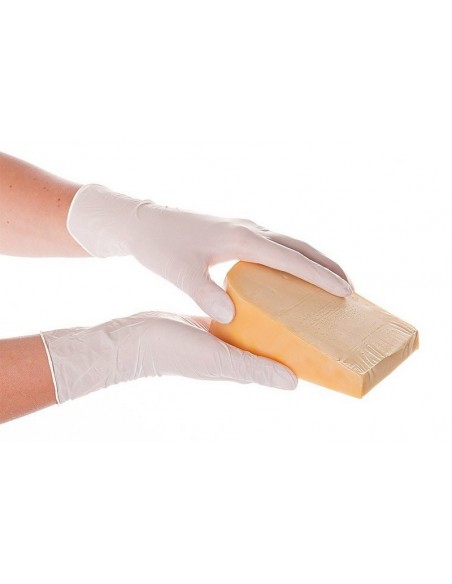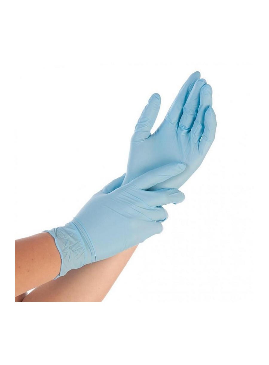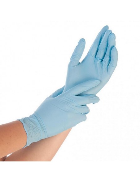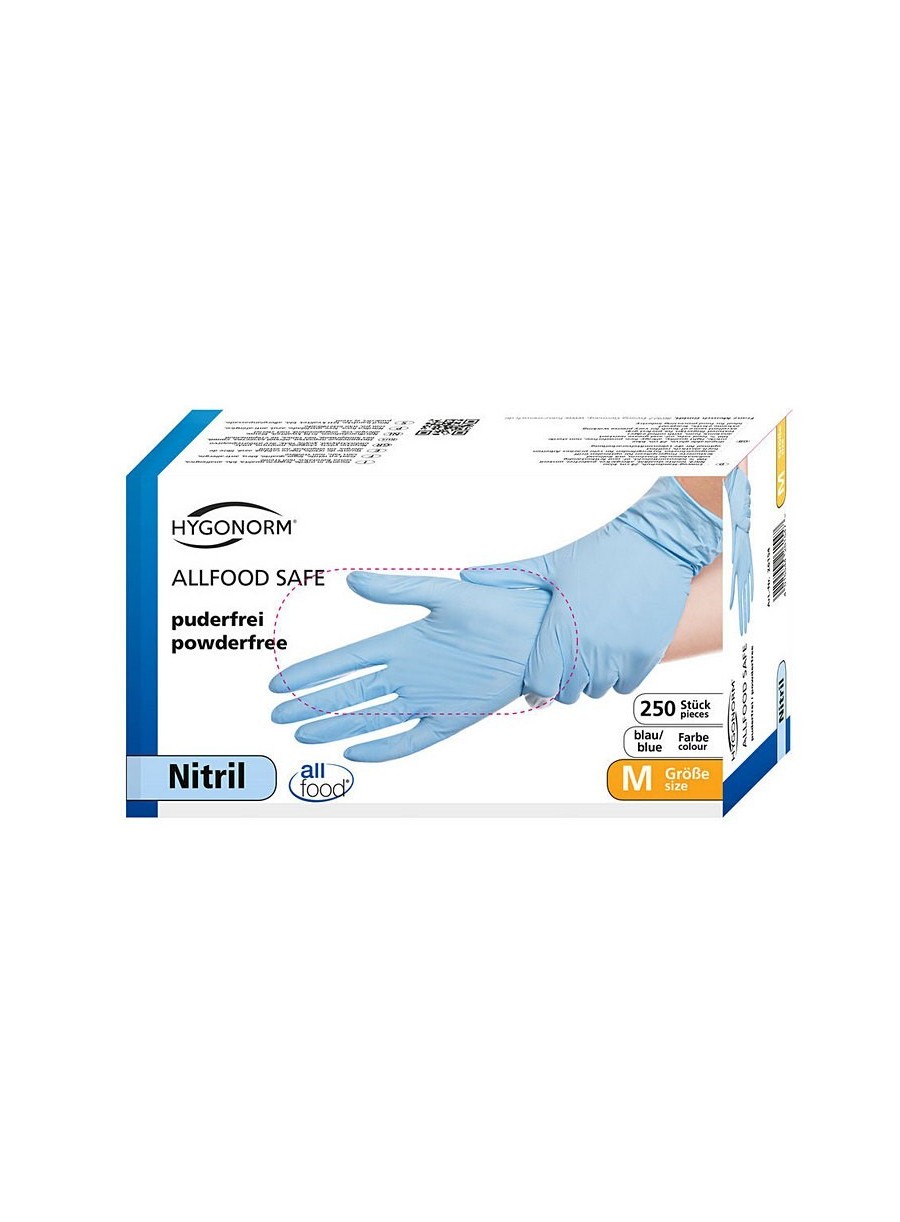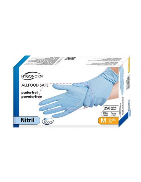 Mănuși de unică folosință din nitril din gama HYGONORM, nepudrate, calitate standard, 24 cm lungime, non-alergice (100% fără latex), margini răsucite ce împiedică curgerea stropilor la ridicarea brațului, culoare alb/albastru, ambalate în cutii de 250 de bucăți, certificate pentru lucrul în industria alimentară.