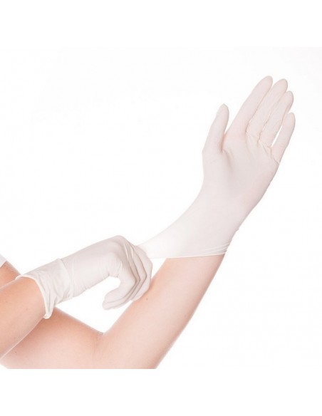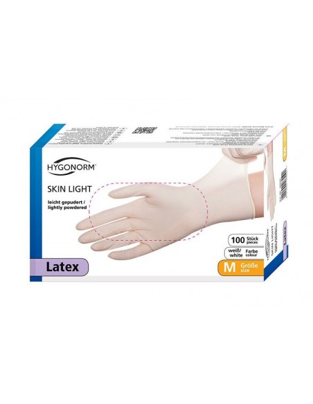 Mănuși de unică folosință din gama HYGONOM, din latex, pudrate, 24 cm lungime, culoare alb, ambalate în cutii de 100 de bucăți.