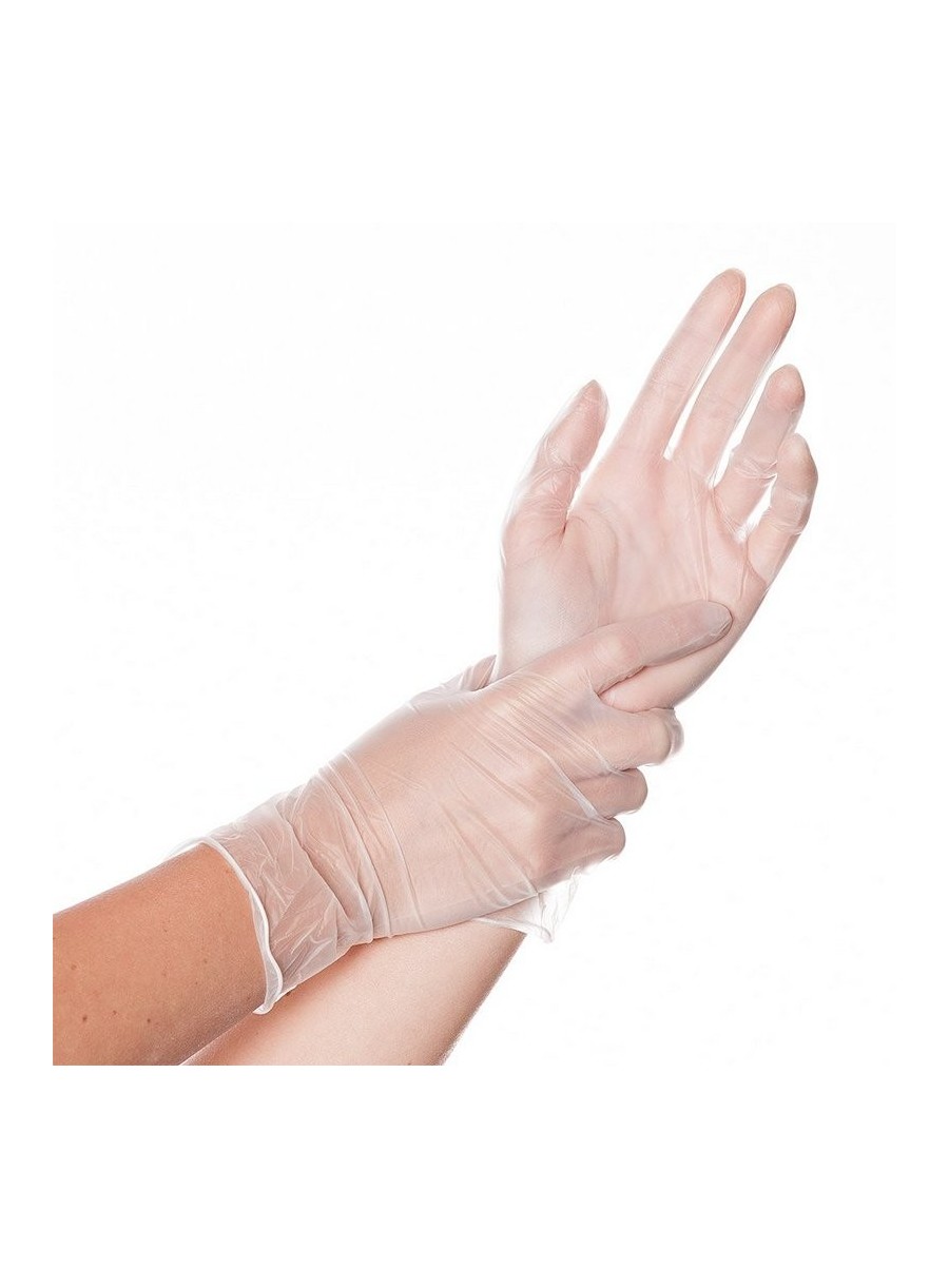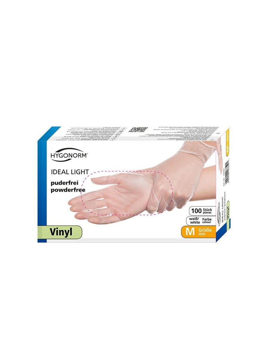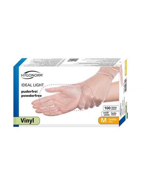 Mănuși de unică folosință din gama HYGOSTAR, din vinyl, nepudrate, calitate standard, fără latex, fără ftalați periculoși, 24 cm lungime, culoare alb, ambalate în cutii de 100 de bucăți.