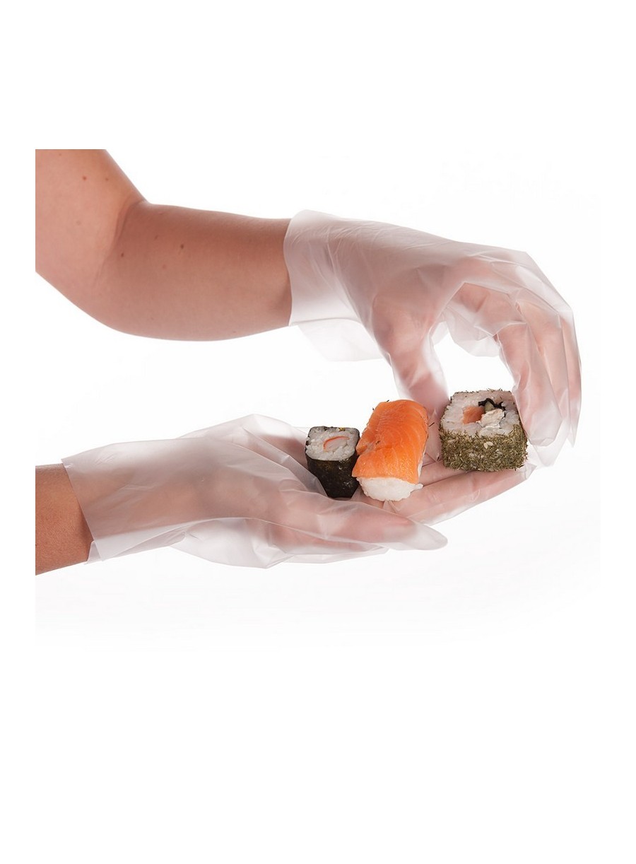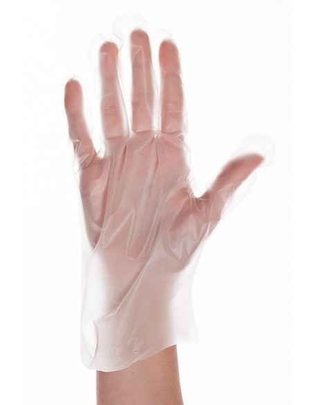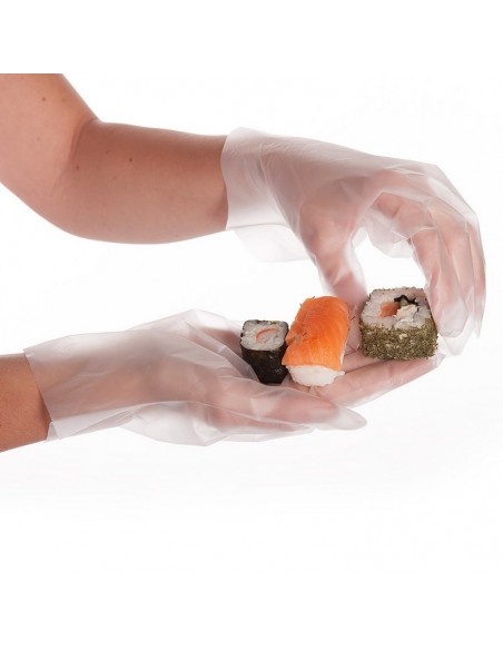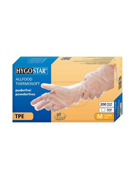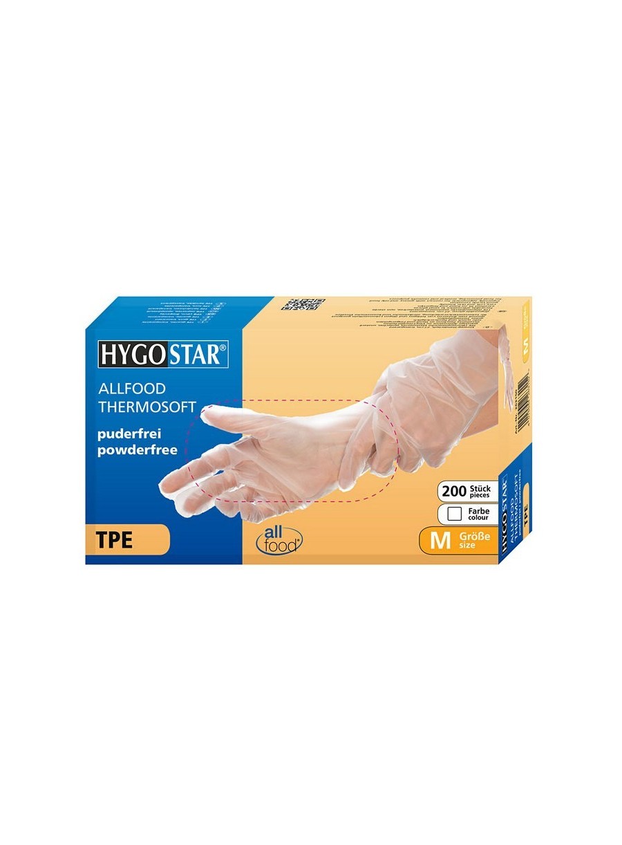 Mănuși de unică folosință din termoplastic (TPE), nepudrate, 25-27 cm lungime, fără ftalați, silicon și latex, elastice, culoare transparent/albastru/negru, ideale în industria alimentară în contactul cu grăsimi și uleiuri, ambalate în cutii de 200 de bucăți.