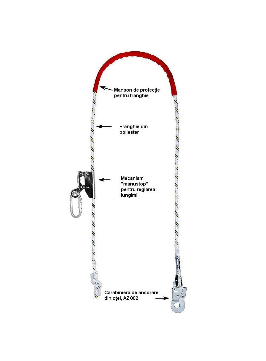 Frânghie de pozititionare din poliamidă, grosime 12 mm, cu ochet și carabinieră 2G la un capăt, cu manustop pentru reglajul diferitelor lungimi necesare în timpul lucrului. Este prevăzută cu un tub textil protector împotriva uzurii premature și poate avea lungimi de: 2 m, 3 m, 4 m, 5 m, 10 m, 15 m, 20 m.