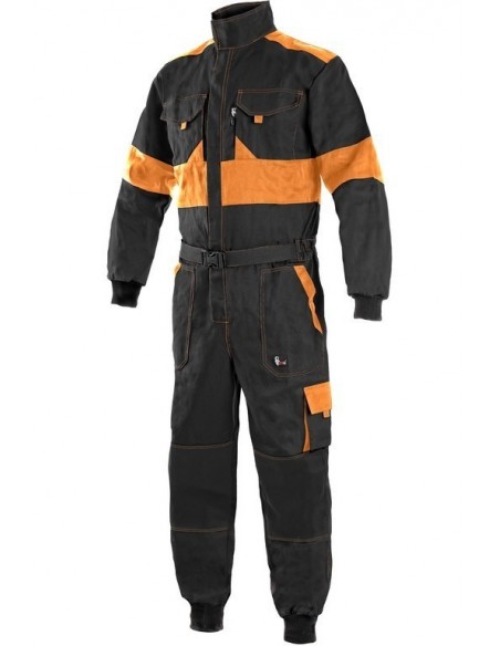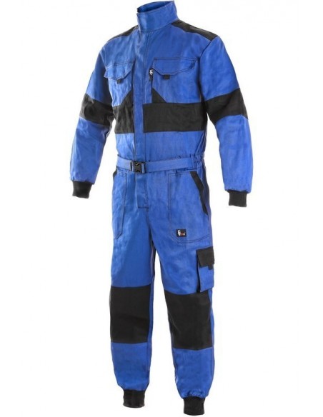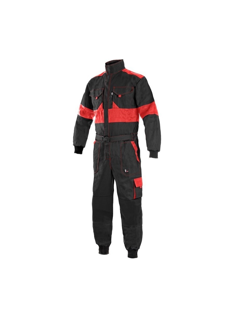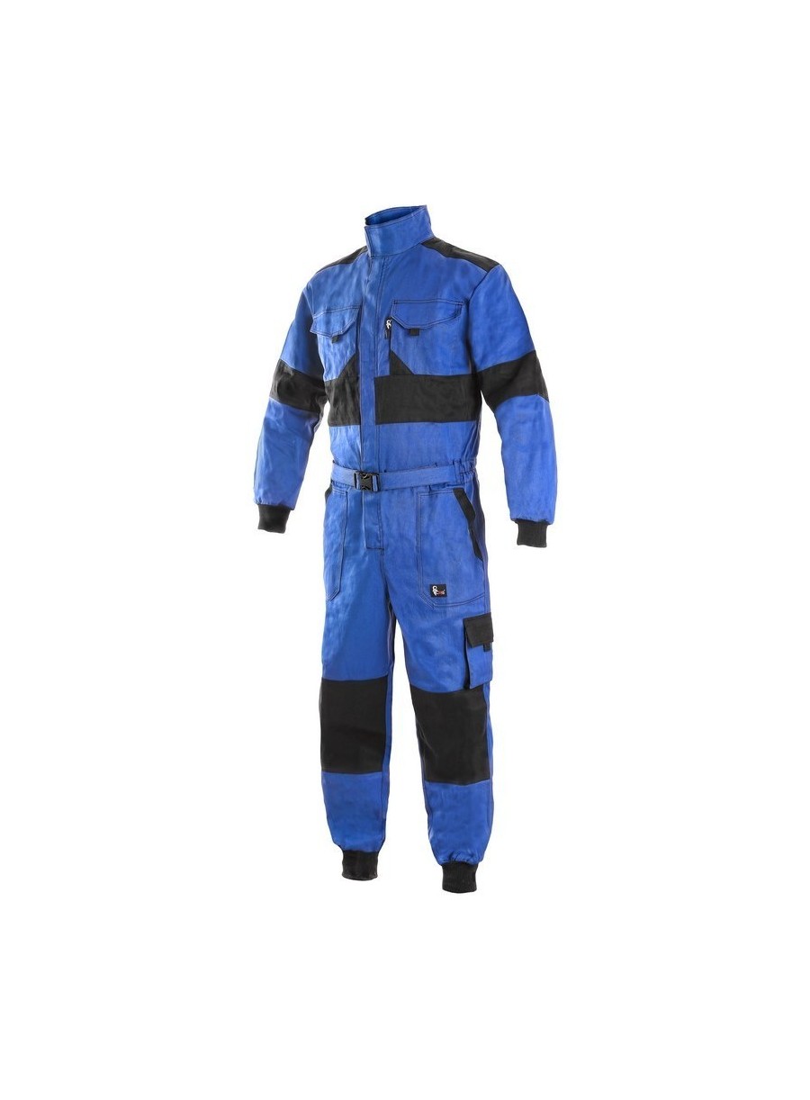 Combinezon de lucru, confecționat din twill 100% bumbac, densitate 260 g/mp, mâneci cu manșetă elastică, închidere cu fermoar dublu sens acoperit cu velcro, buzunare cu clapetă la piept, buzunar cu fermoar, ascuns la piept, curea cu cataramă ajustabilă în talie, buzunare frontale, buzunare laterale pentru telefon/ruletă, buzunar cu clapetă la spate, genunchi întăriți, culori: albastru-negru, negru-portocaliu, negru-rosu