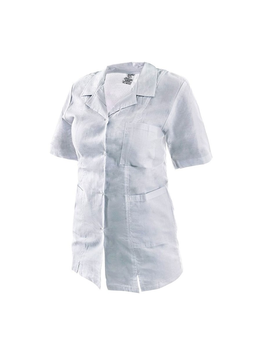 Bluză de lucru confecționată din bumbac 100%, 145 g/m², cu mâneci scurte, talie cambrată, 3 buzunare, cordon cu nasture pentru reglare talie, la spate.