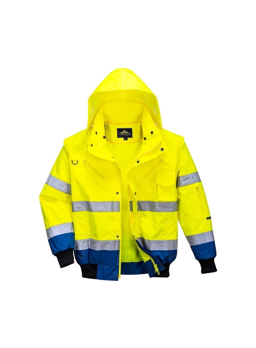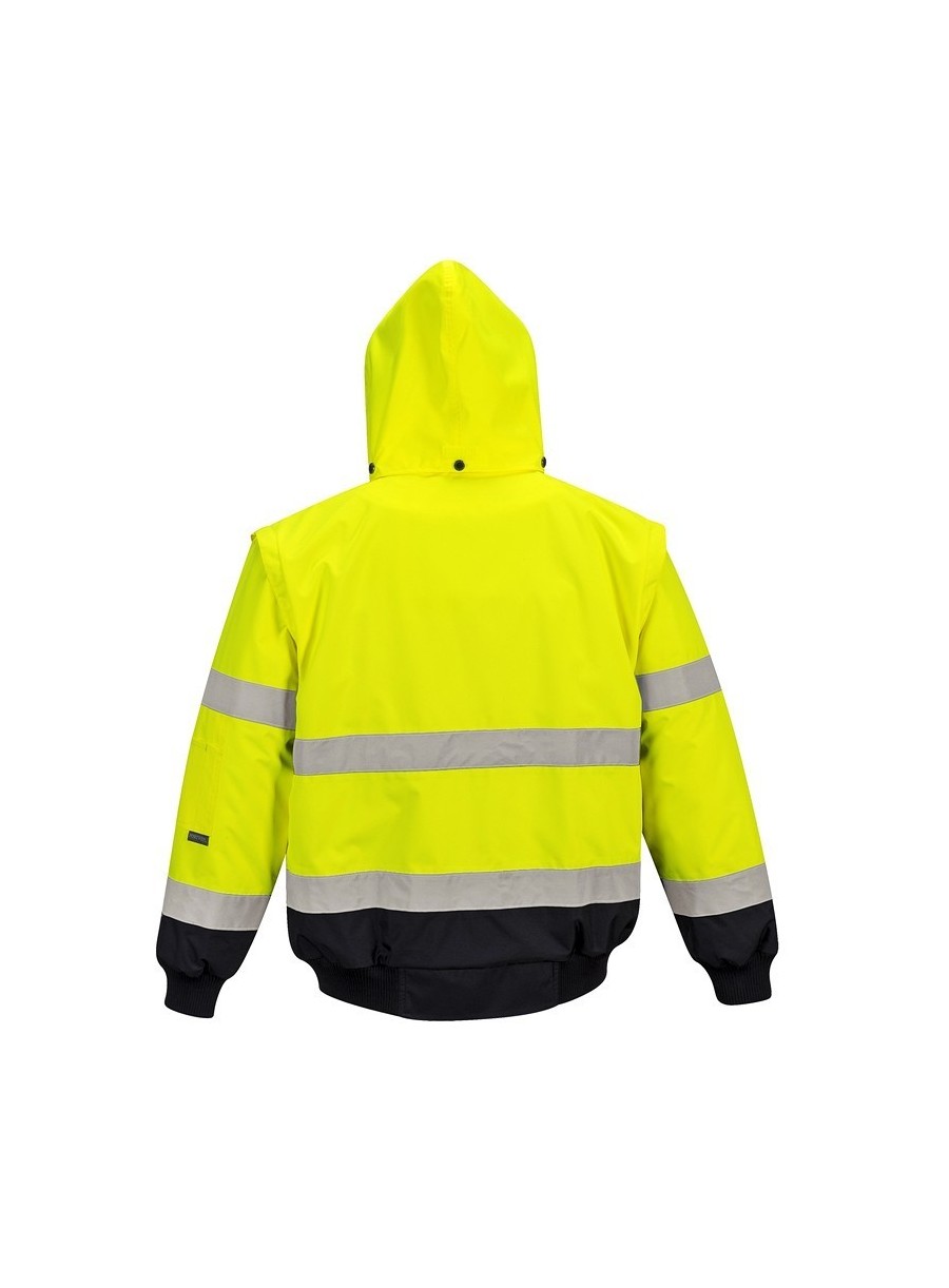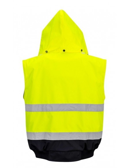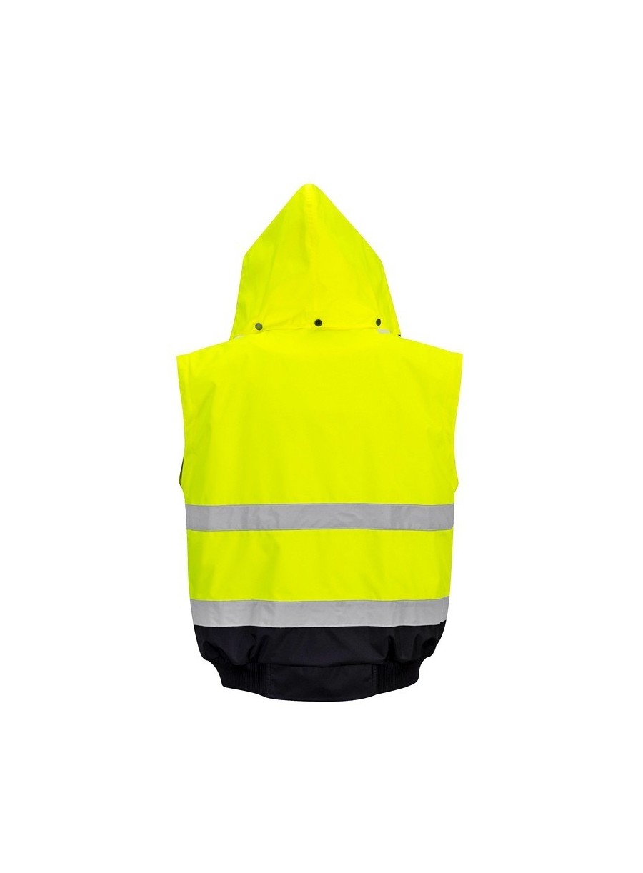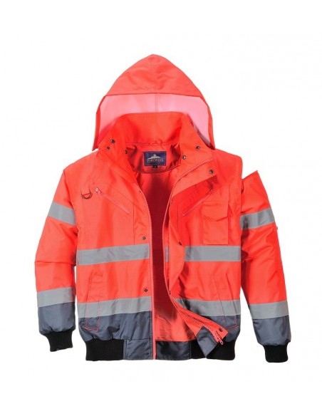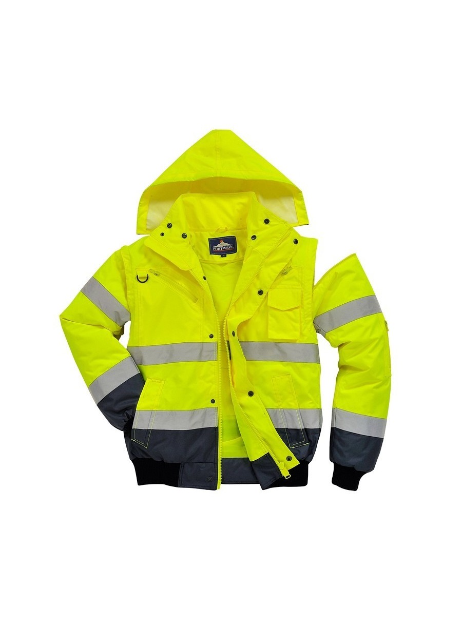 Jachetă 3 în 1 înaltă vizibilitate, confecționată din 100% poliester, fibră Oxford 300D, strat superior din poliuretan, rezistent la pete, 190 g/m², căptușeală 100% poliester, glugă detașabilă pentru funcționalitate sporită, 8 buzunare, mânecile detașabile, căptușeala si gulerul de blană oferă multiple opțiuni de folosire, mâneci și tiv tricotate, fermoar dublu pentru funcționalitate sporită, finisaj extrem de rezistent la apă, respinge apa de la suprafața materialului, guler de blană detașabil.