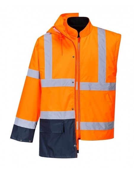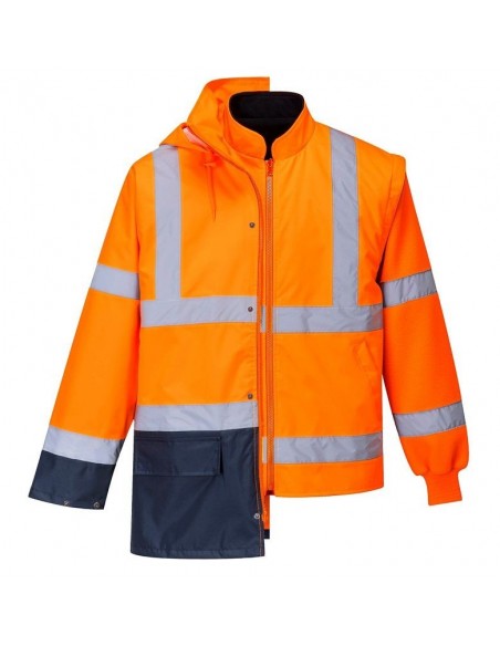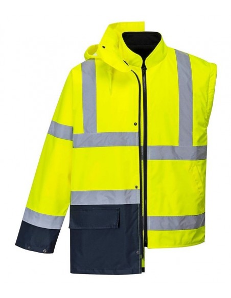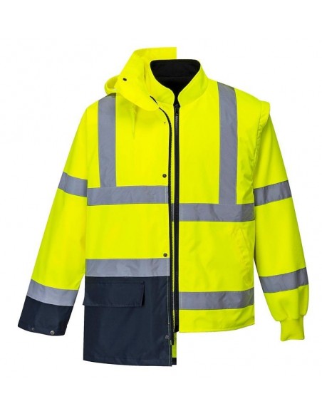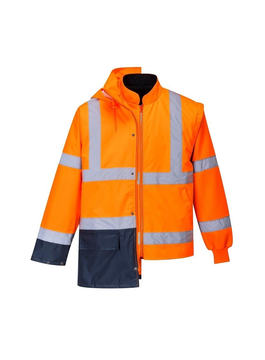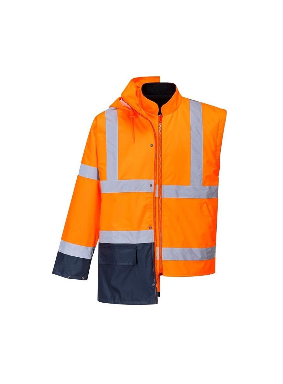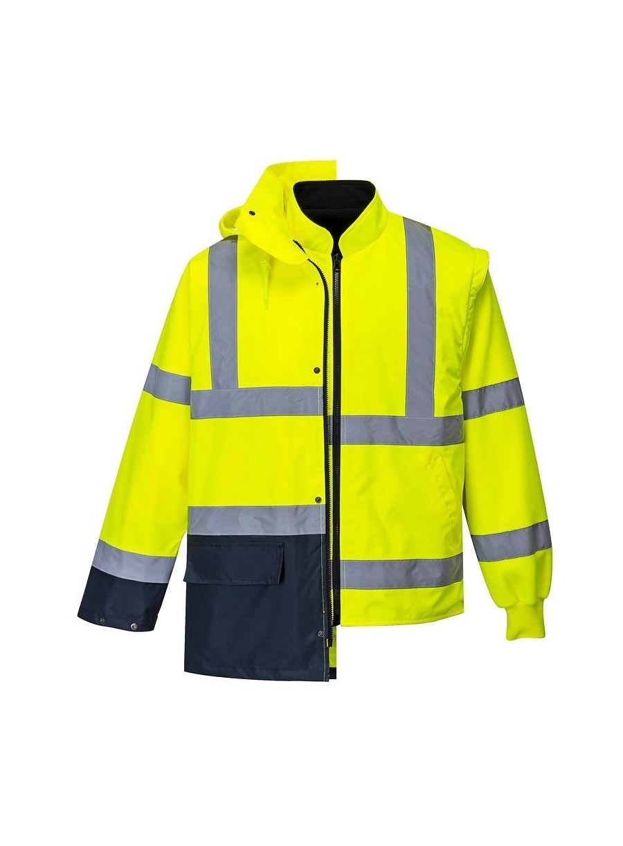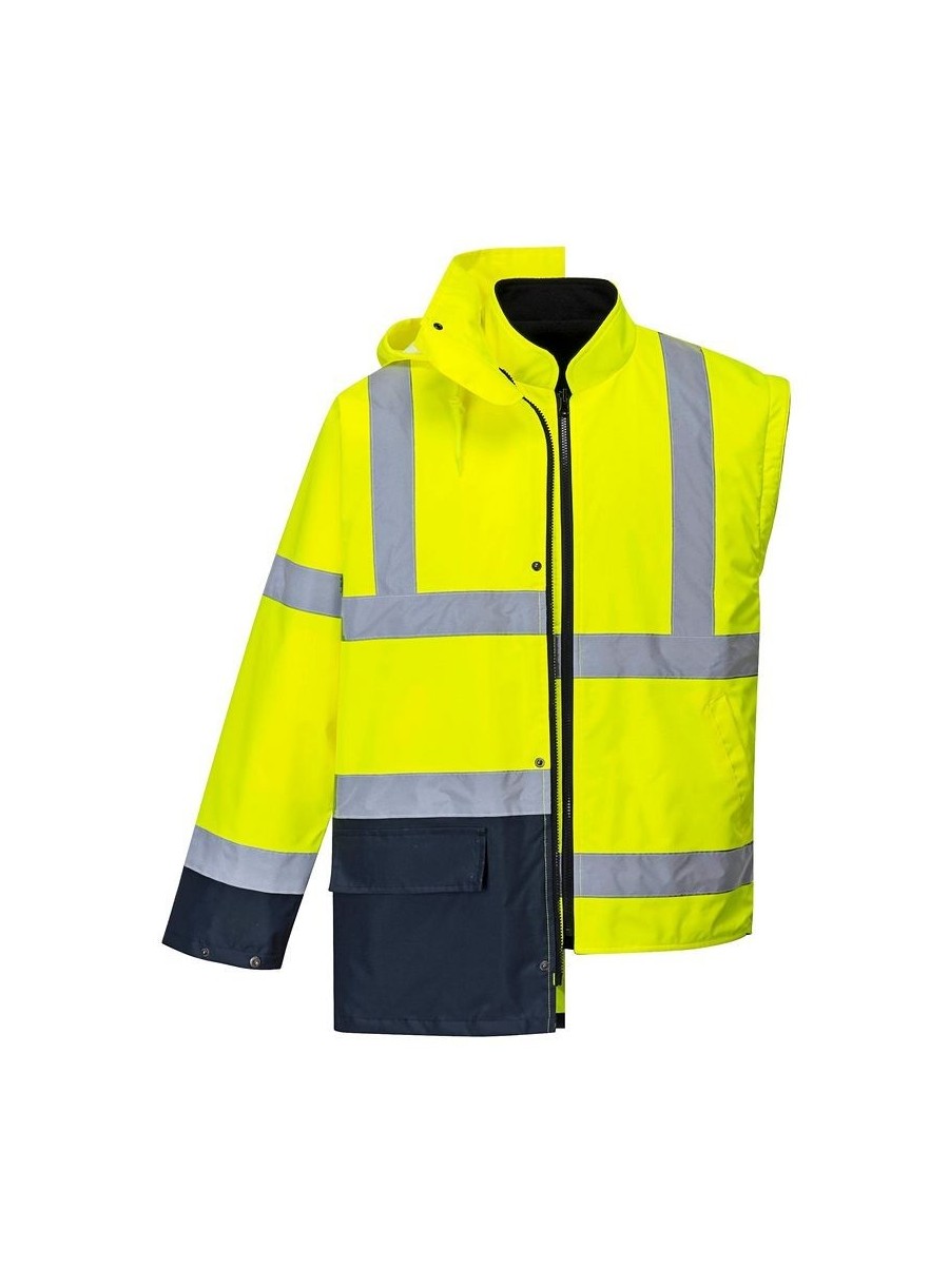 Jachetă HiVis 5-în-1, 100% poliester, fibră Oxford 300D, strat superior din PU, rezistent la pete 190g, finisaj extrem de rezistent la apă, jachetă interioară impermeabilă cu mâneci fluorescente din fleece detaşabile, benzi reflectorizante pe mâneci şi corp, elemente de culoare albastru marin pentru contrast, mâneci detaşabile, manşete cu capse, glugă ascunsă, fermoar reversibil, buzunar ascuns pentru telefonul mobil.