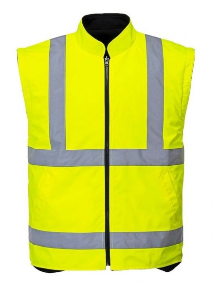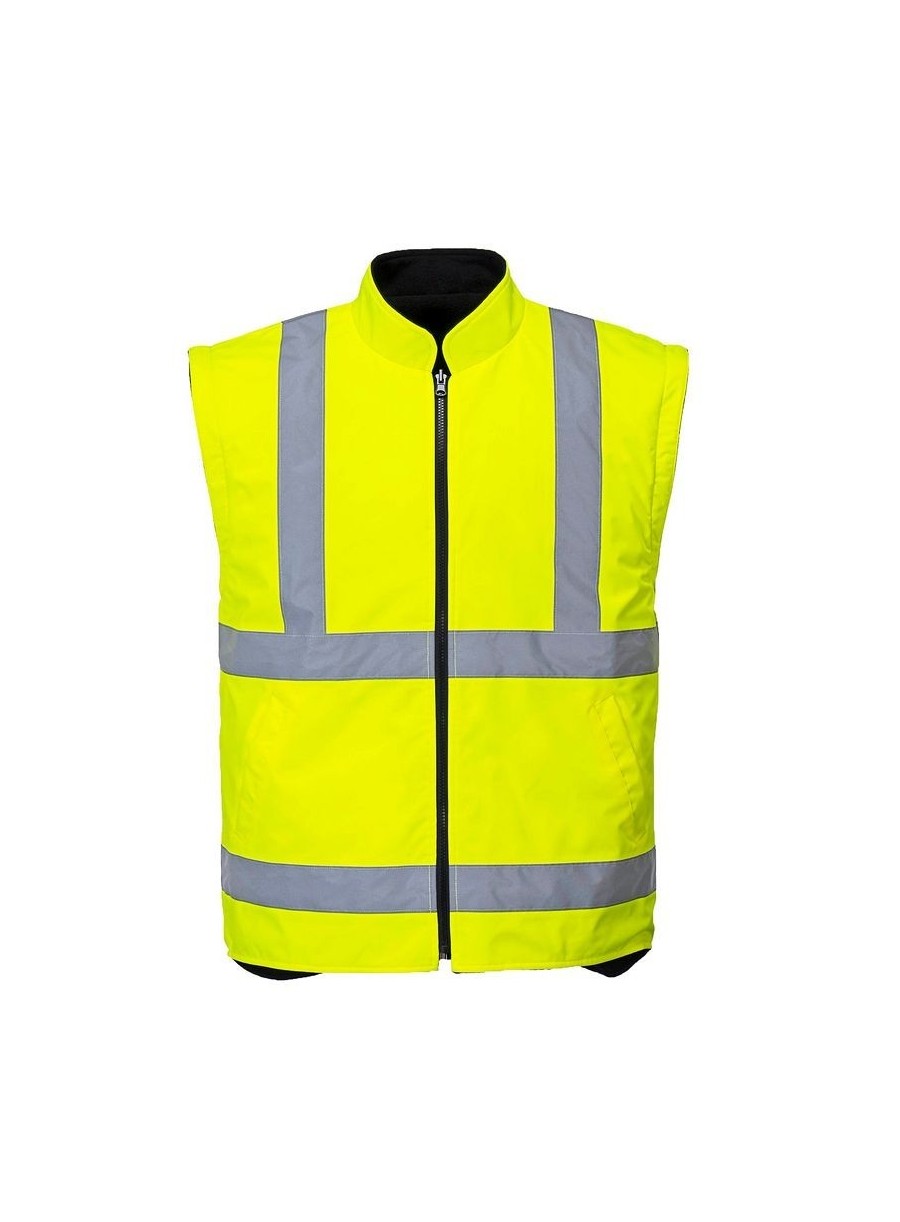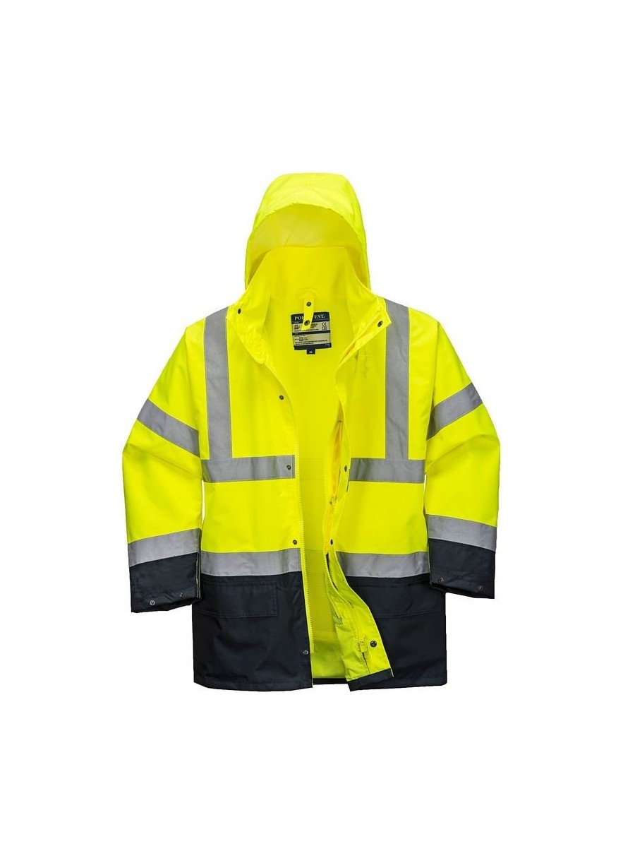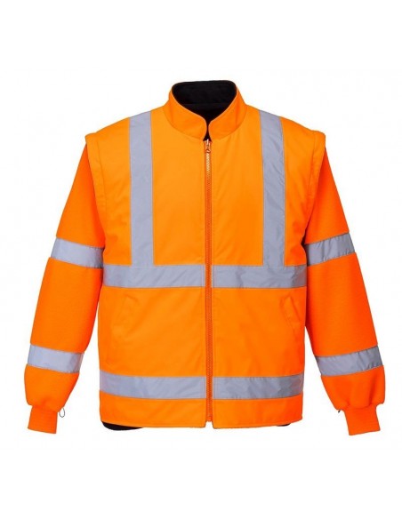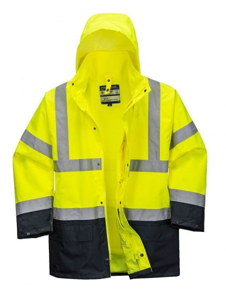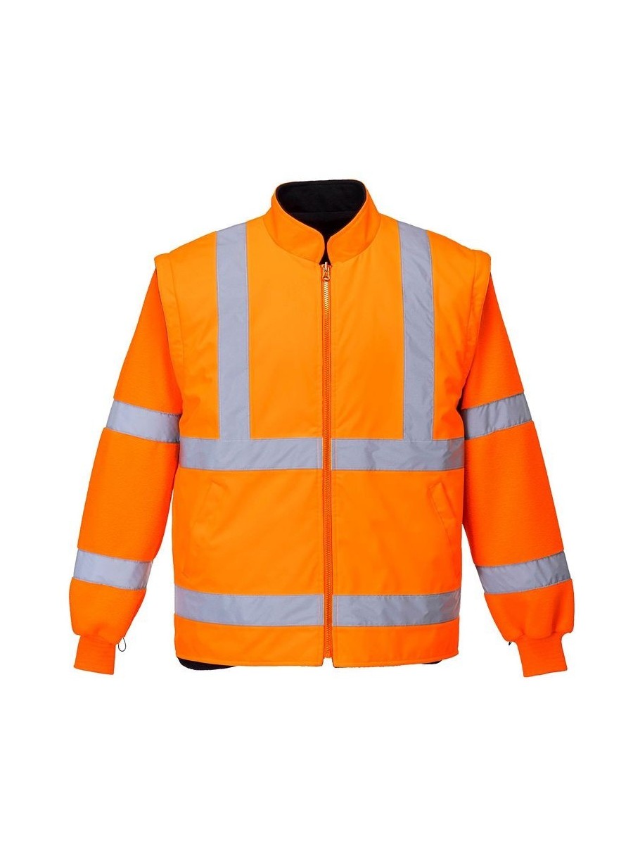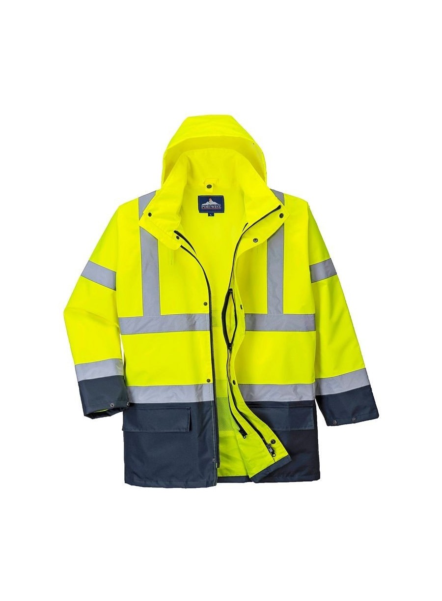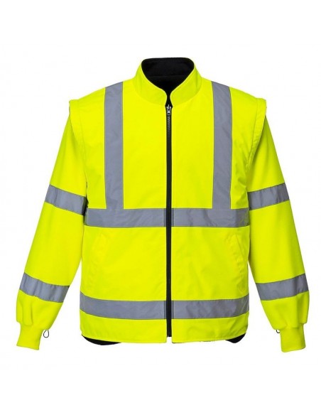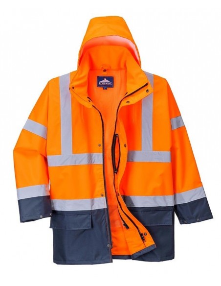 Jachetă HiVis 5-în-1, 100% poliester, fibră Oxford 300D, strat superior din PU, rezistent la pete 190g, finisaj extrem de rezistent la apă, jachetă interioară impermeabilă cu mâneci fluorescente din fleece detaşabile, benzi reflectorizante pe mâneci şi corp, elemente de culoare albastru marin pentru contrast, mâneci detaşabile, manşete cu capse, glugă ascunsă, fermoar reversibil, buzunar ascuns pentru telefonul mobil.