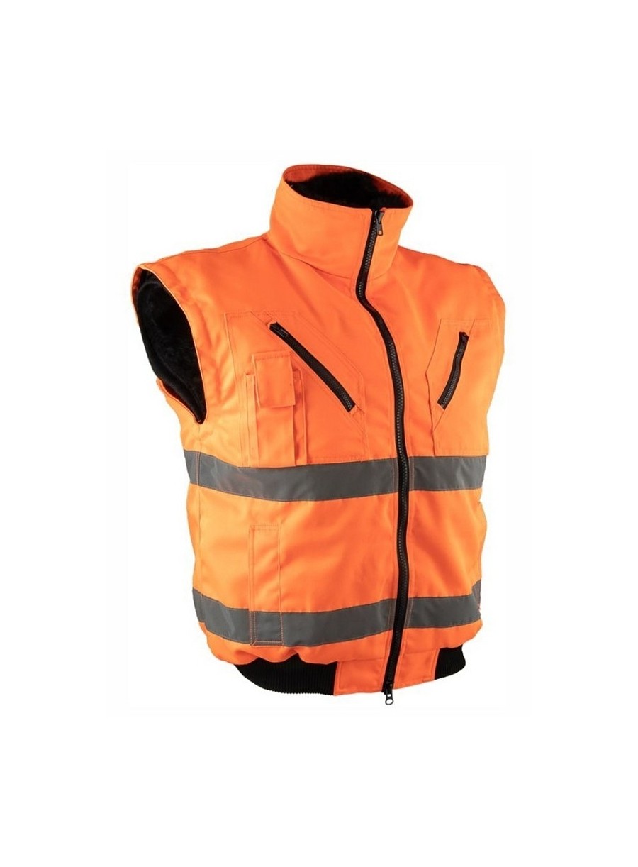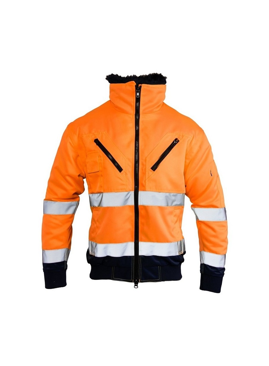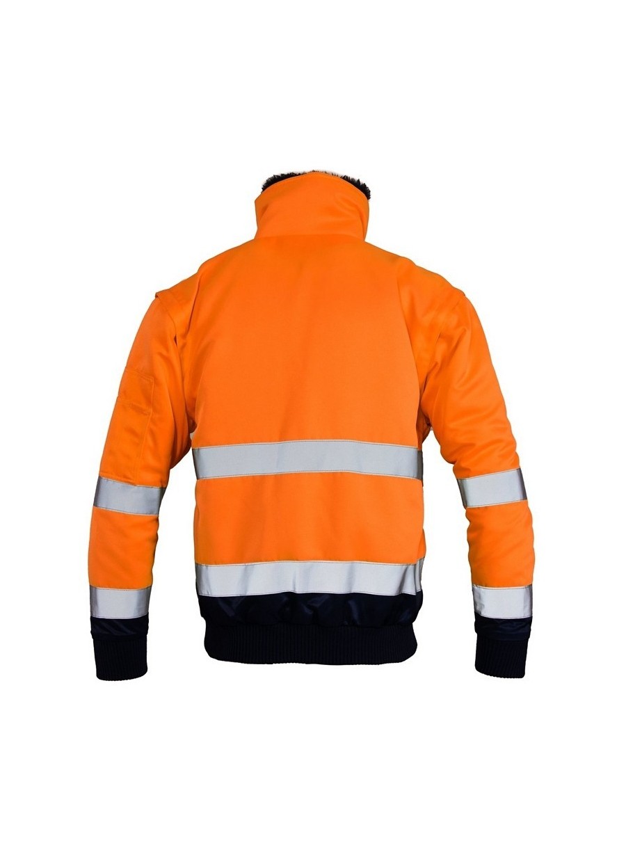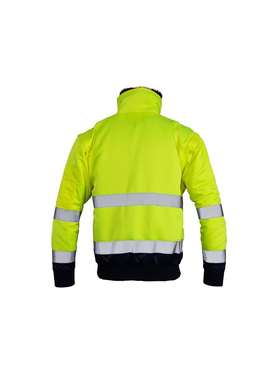 Jachetă Bomber HiVis 3-în-1, 80% poliester/20% bumbac, 280g ⁄m², finisaj extrem de rezistent la apă, căptuşeală detaşabilă din blană 100% poliester, 500g ⁄m², guler detaşabil, mâneci detaşabile, manşete elastice, 2 buzunare laterale, buzunar pentru telefonul mobil, buzunar interior, 2 buzunare la piept închidere cu fermoar, 2 benzi reflectorizante, închidere frontală cu fermoar.