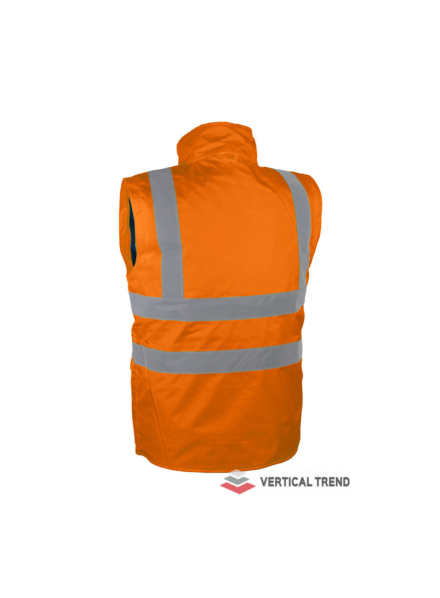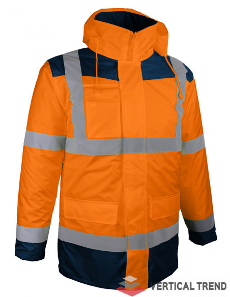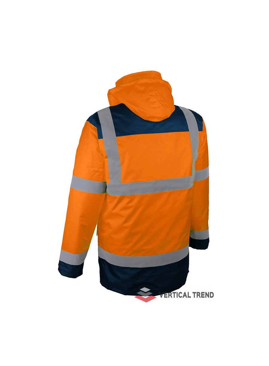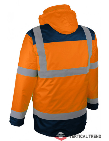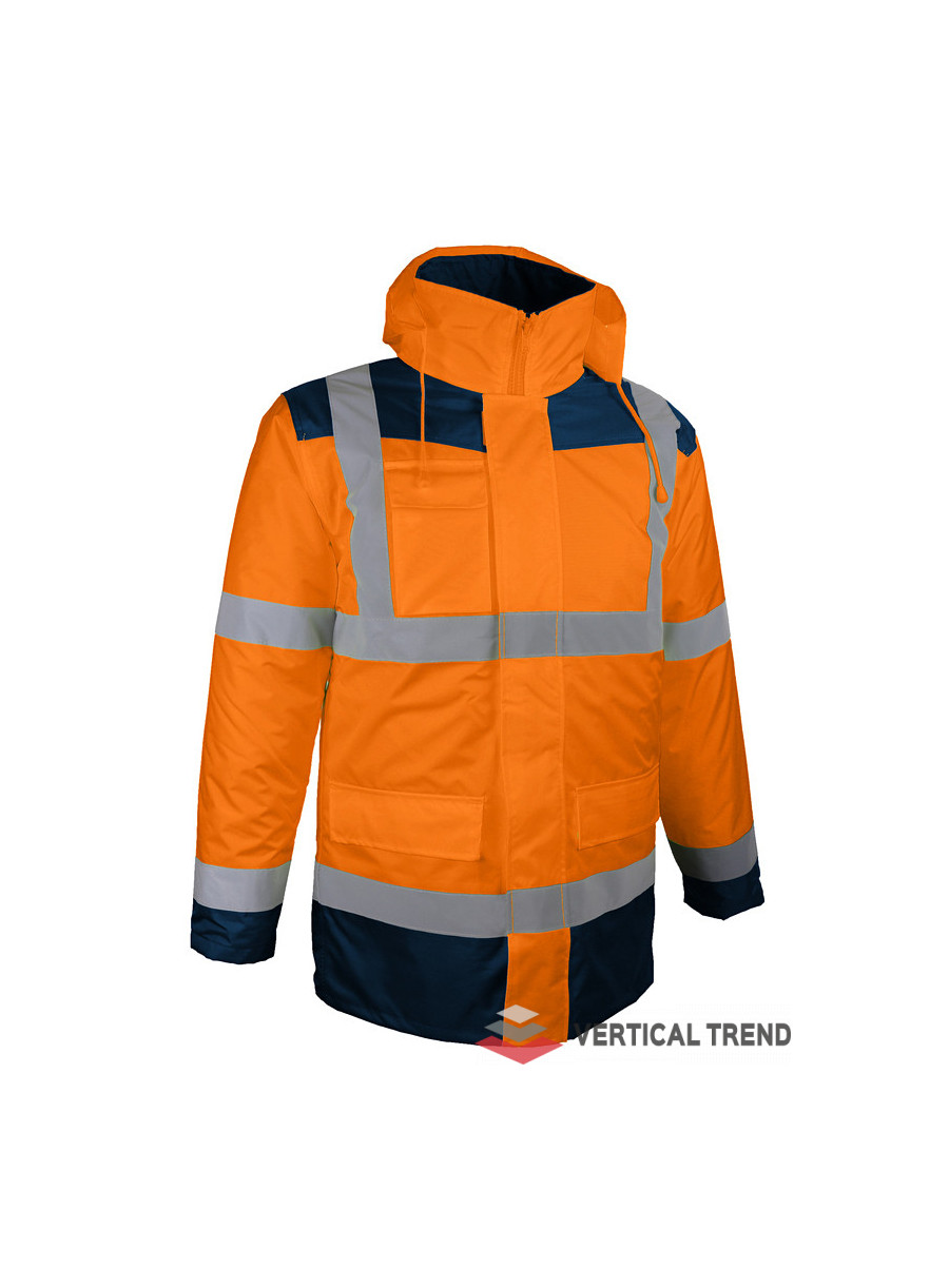 Jachetă reflectorizantă de mare vizibilitate 4in1. Jachetă exterioară cu benzi retro-reflectorizante gri, 2 buzunare interioare și 3 exterioare, glugă ascunsă rulată în interiorul gulerului, fermoar frontal bidirecțional durabil, sub clapetă cu scai, confecționată la exterior din poliester Oxford 300D cu acoperire poliuretanică (PU) iar la interior căptușeală din poliester, bicolor: orange / bleumarin. Vestă interioară cu mâneci lungi, detașabile, cu 1 buzunar interior și 3 exterioare, confecționată la exterior din poliester Oxford 300 D cu acoperire poliuretanică iar la interior lână polară 280 g / mp, culoare orange.
