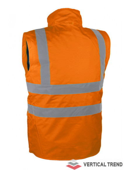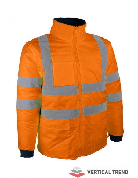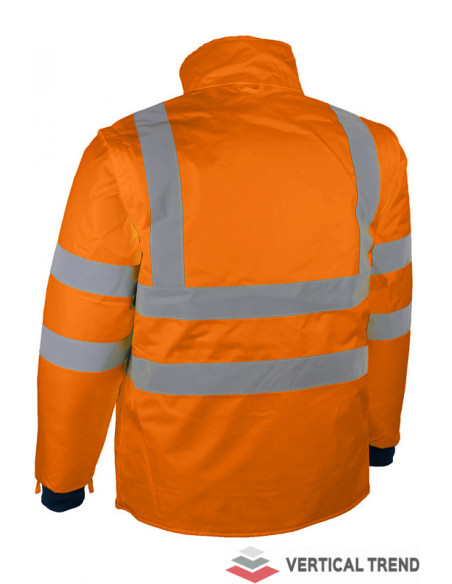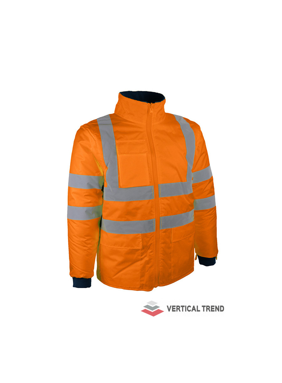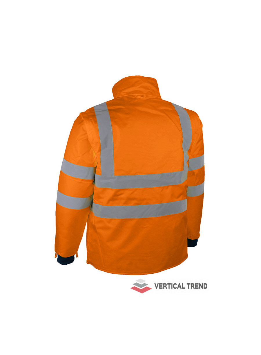 Jachetă reflectorizantă de mare vizibilitate 4in1. Jachetă exterioară cu benzi retro-reflectorizante gri, 2 buzunare interioare și 3 exterioare, glugă ascunsă rulată în interiorul gulerului, fermoar frontal bidirecțional durabil, sub clapetă cu scai, confecționată la exterior din poliester Oxford 300D cu acoperire poliuretanică (PU) iar la interior căptușeală din poliester, bicolor: orange / bleumarin. Vestă interioară cu mâneci lungi, detașabile, cu 1 buzunar interior și 3 exterioare, confecționată la exterior din poliester Oxford 300 D cu acoperire poliuretanică iar la interior lână polară 280 g / mp, culoare orange.