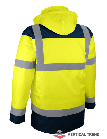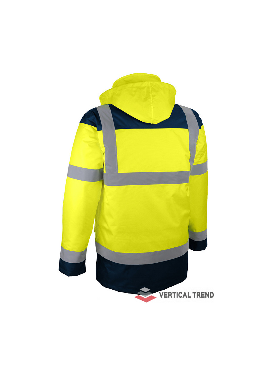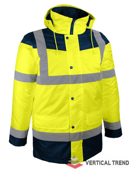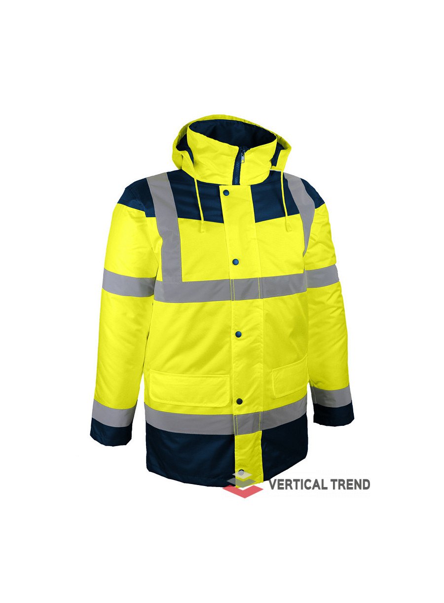 Jachetă reflectorizantă de mare vizibilitate, cu benzi retro-reflectorizante verticale și orizontale, culoare bleumarin / galben, confecționată din poliester Oxford 300D cu acoperire poliuretanică, căptușeală din poliester 180 g / mp, 2 buzunare interioare și 2 exterioare, glugă ascunsă rulată în interiorul gulerului, manșete tricotate, închidere frontală cu fermoar bidirecțional, sub clapetă cu capse.