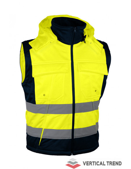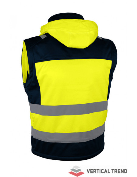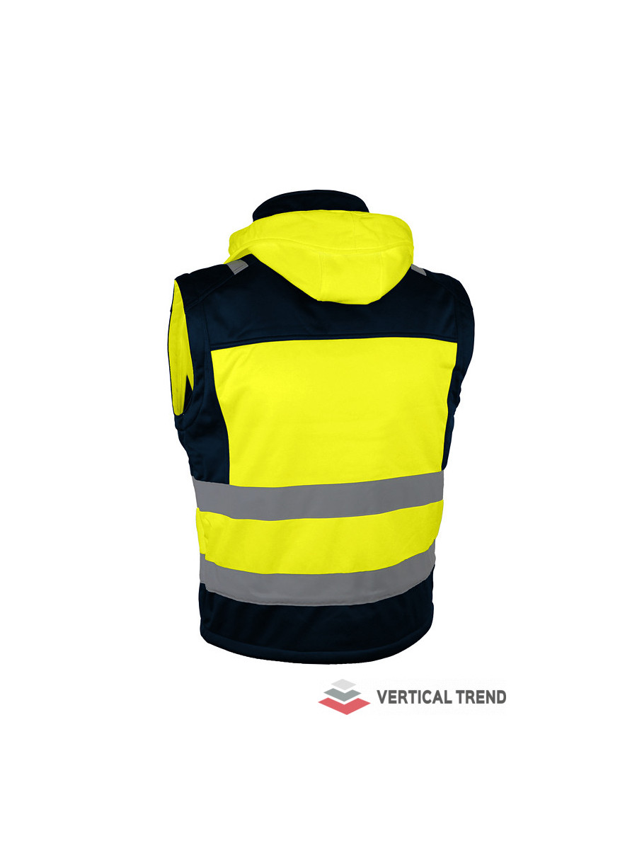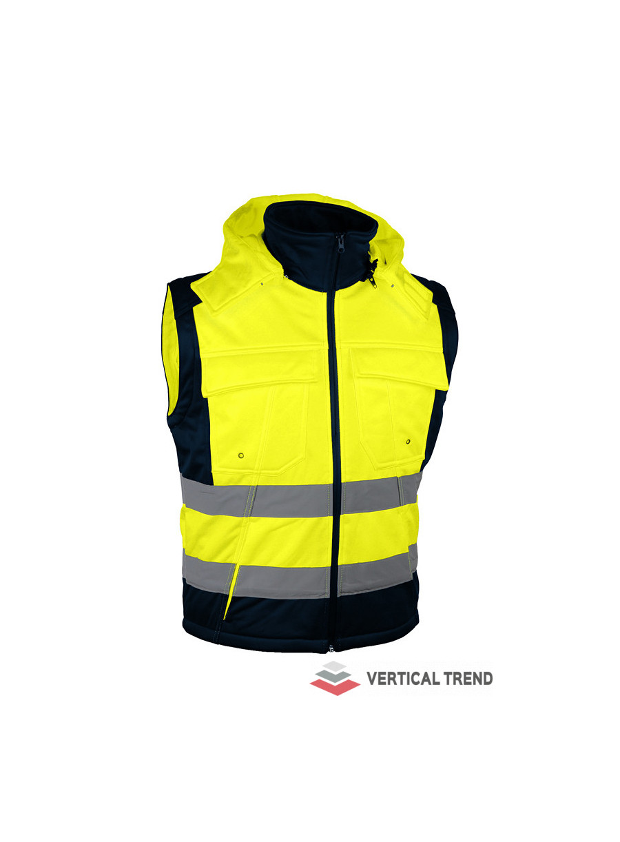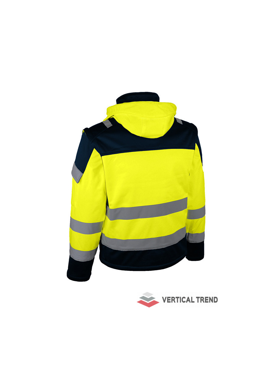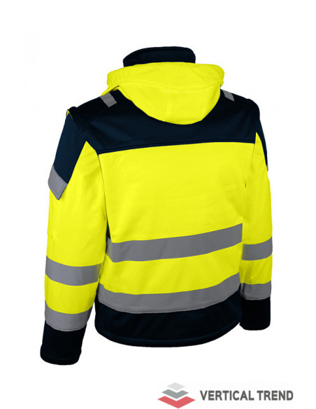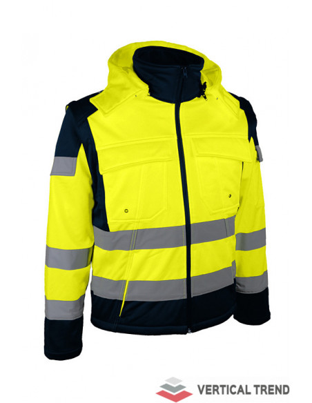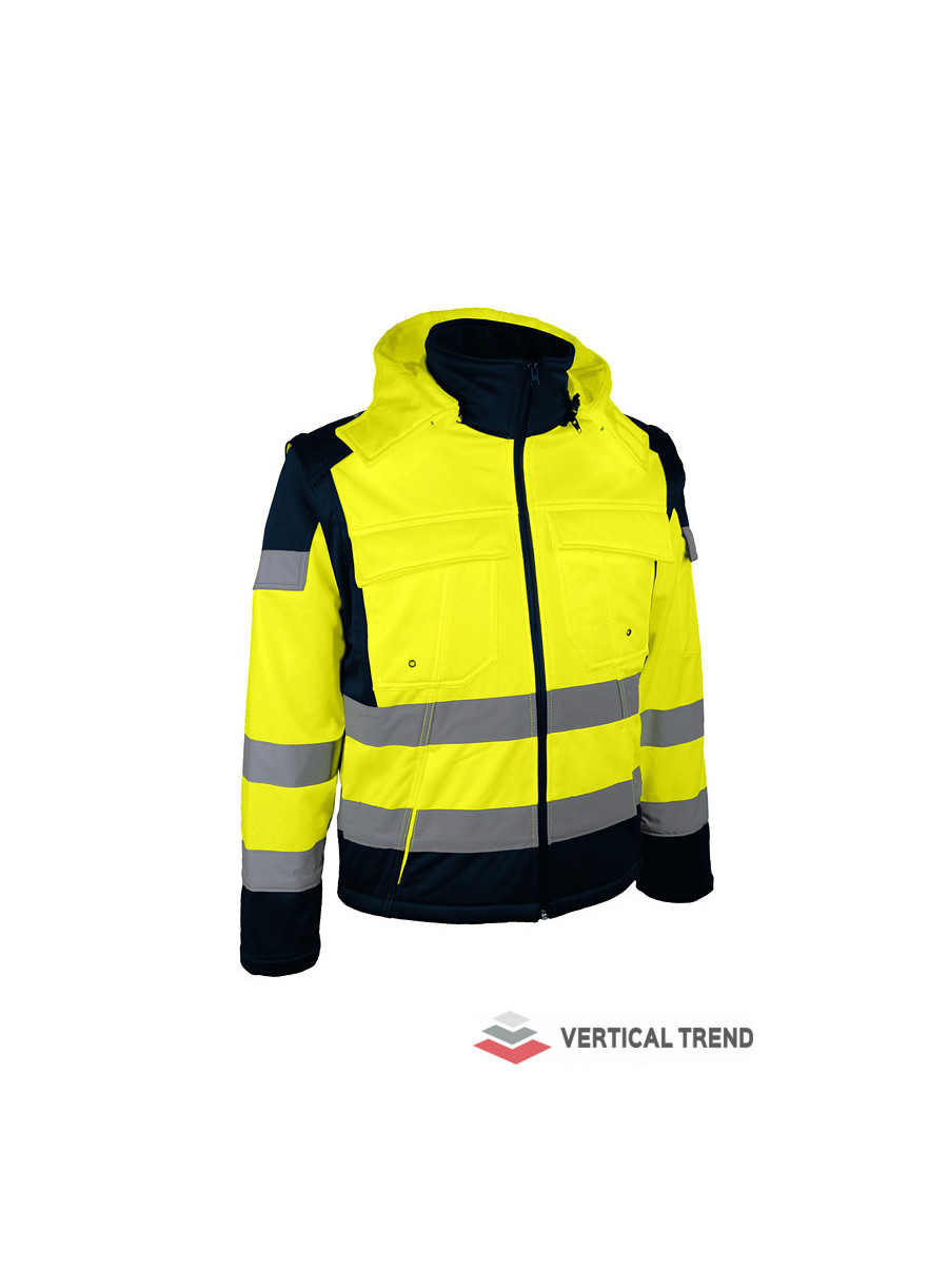 Jachetă reflectorizantă de mare vizibilitate 2in1, cu benzi retro-reflectorizante orizontale, culoare galben/bleumarin, confecționată din poliester 350 g/mp cu acoperire TPU, căptușeală din poliester fleece polar, 2 buzunare interioare și 5 exterioare, glugă detașabilă cu fermoar, manșete tricotate sub mânecă, mâneci detașabile, închidere frontală cu fermoar rezistent la apă.