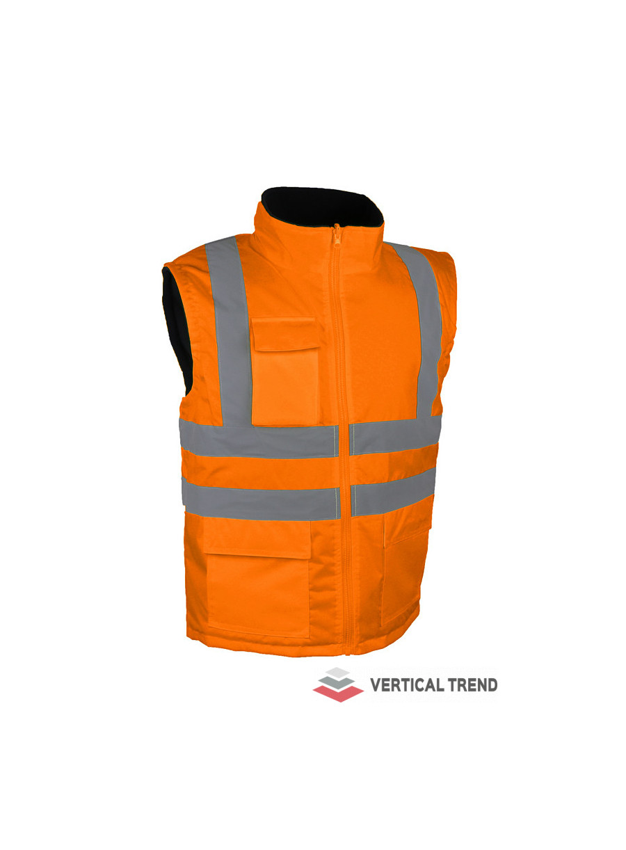 Vestă reflectorizantă de mare vizibilitate, confecționată din 100% poliester Oxford 300D cu acoperire poliuretanică, căptușeală din fleece polar 260 g/mp, benzi retro-reflectorizante orizontale și verticale, 3 buzunare exterioare, 1 buzunar interior, închidere cu fermoar, culoare orange.