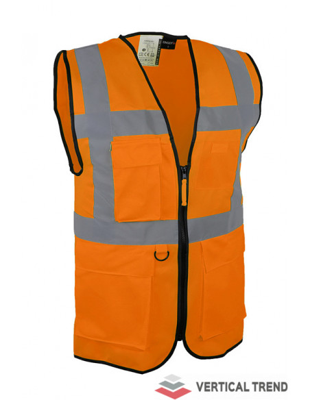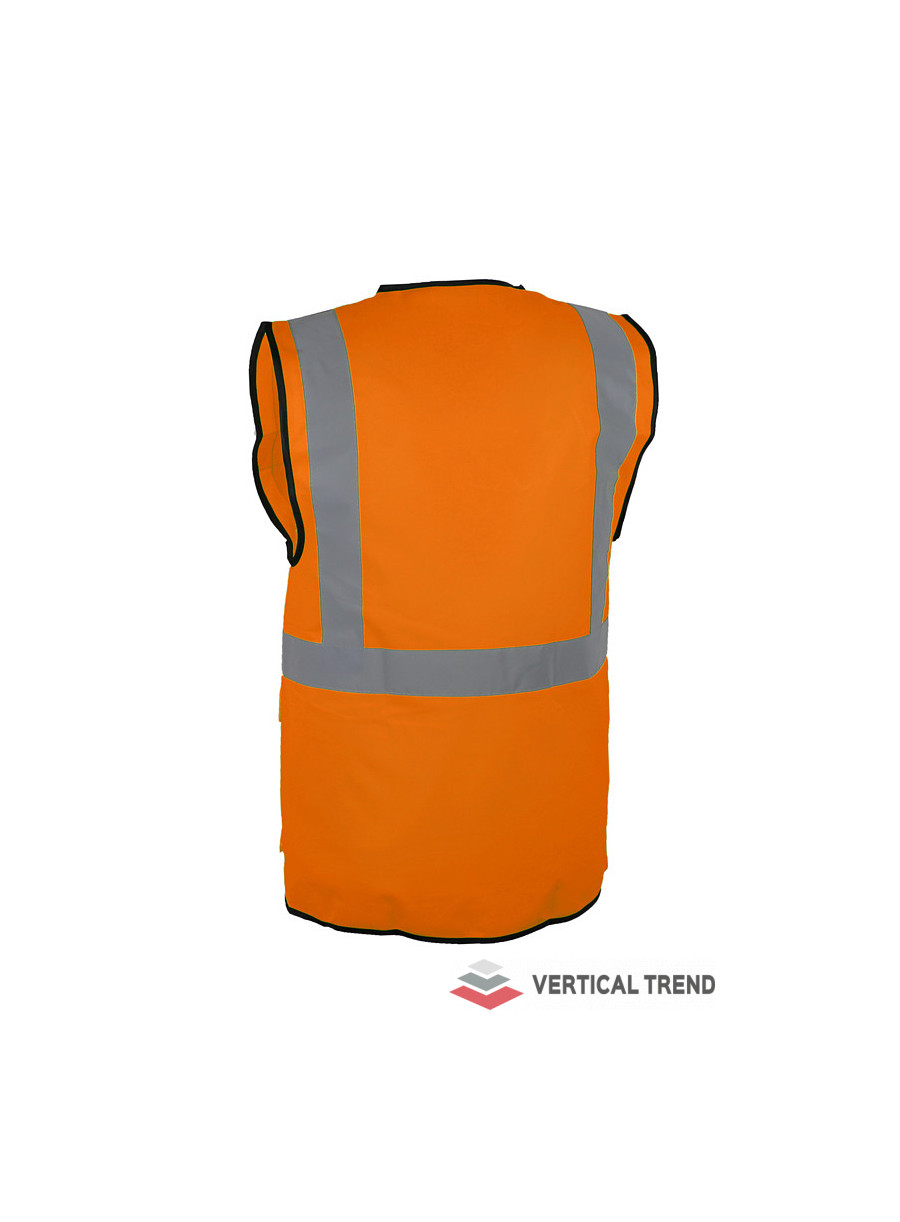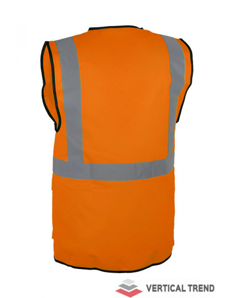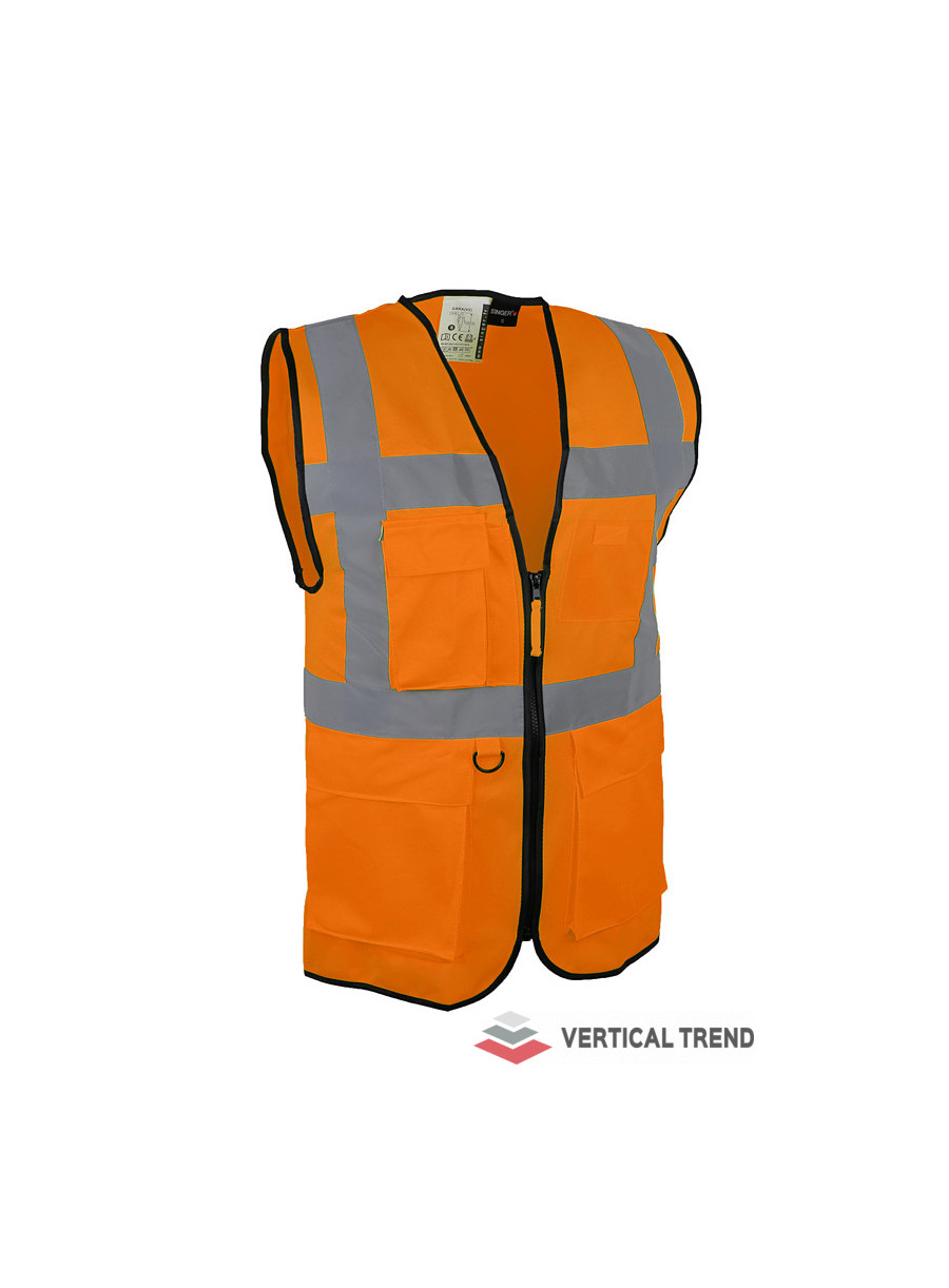 Vestă reflectorizantă de mare vizibilitate, confecționată din 100% poliester, 120 g/mp, benzi retro-reflectorizante orizontale și verticale, 2 buzunare exterioare cu clapeta cu scai, închidere cu fermoar, suport de insignă din plastic transparent, inel cu clemă D din plastic negru, tiv negru, culoare orange.