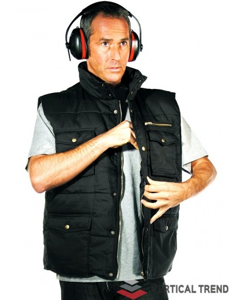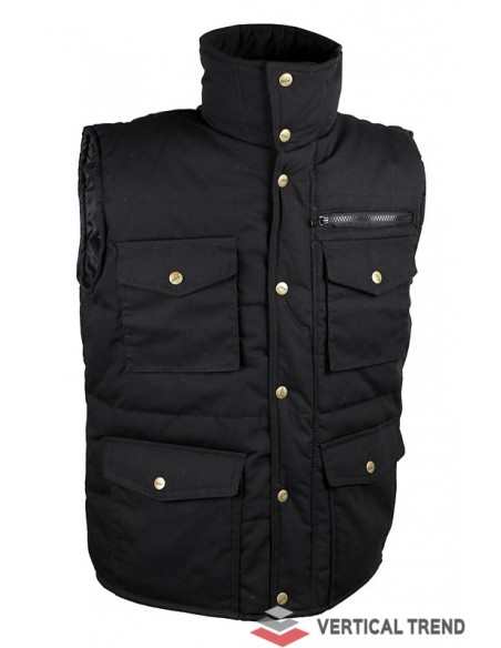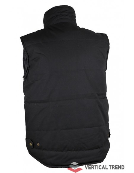 Vestă de iarnă, cu protecție a zonei lombare, confecționată din 65% poliester și 35% bumbac, căptușeală din poliester tafta, guler înalt, 8 buzunare, închidere cu fermoar frontal sub clapetă și butoni de presare, culoare neagra.