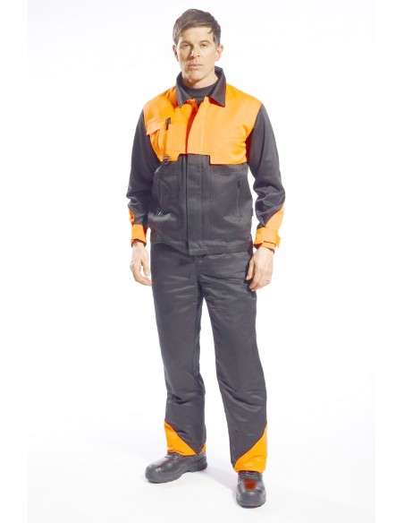 Pantaloni cu betelie pentru fasonatori cu betelie posterioară elastică, betelie cu bucle, buzunare laterale, buzunar posterior, conține 9 straturi de protecție aplicate pe partea frontală a fiecărui picior, ce oprește lanțul moto-fierăstrăului, potrivit pentru lucrul cu lemnele, respirabil, rezistent la apă și transpirație (acțiune capilară), oferă flexibilitate și mobilitate simultan, confecționat din material 65% poliester, 35% bumbac 245gr/mp, căptușeală 43% poliester, 57% polipropilenă 120gr/mp, conf EN ISO 381-5:1995 CLASA 1, TIP A 20m/s, ideal pentru mediul forestier, culori negru/portocaliu, mărimi S - 3XL, Produs certificat KWF.