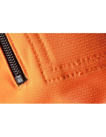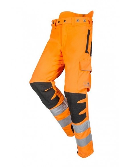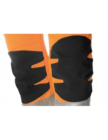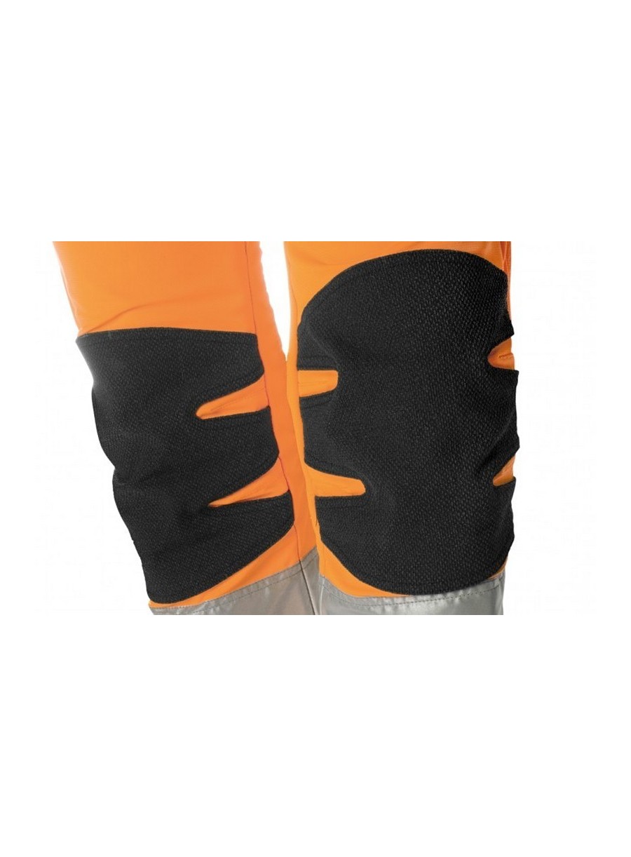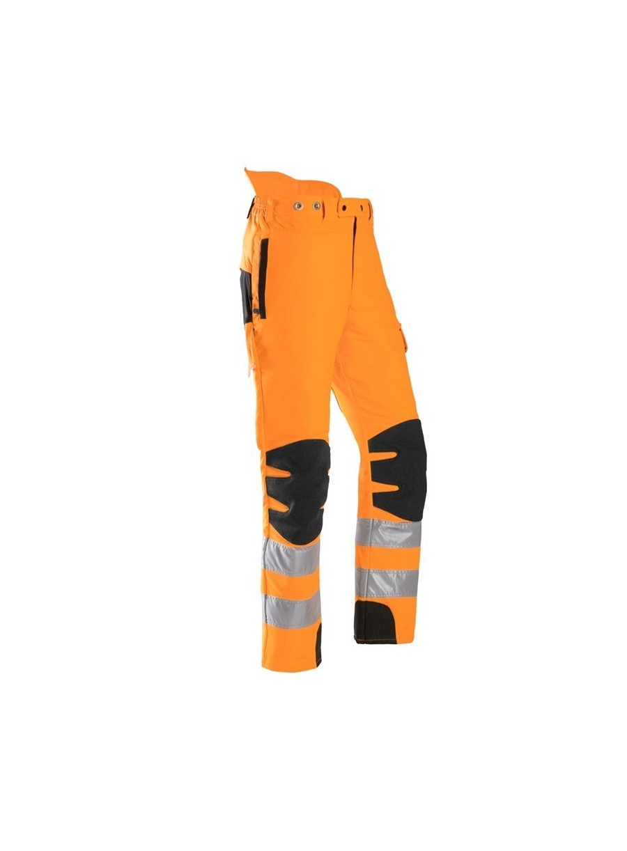 Pantaloni talie, de protecție pentru lucrul cu motofierăstrăul, cerificați KWF conform EN 381-5, CLASA 12, confecționați din țesătura multistrat 6 straturi, de Dyneema, pe toată partea frontală, ce oprește lanțul motofierăstrăului, material TeXXion 86% Cordura, 14% elastan, protecție la spate pentru rinichi, căptușeală protectoare ce oprește lanțul drujbei pe toată partea frontală, talie elastică la mijloc, fante de ventilare cu fermoar în partea din spate a picioarelor ce se pot deschide pentru o mai bună aerisire, multiple buzunare, cusături triple pe partea interioară a picioarelor, culori – roșu/negru/galben neon, portocaliu Hi-Vis/negru, echipament profesional pentru sezonul primăvră-vară-toamnă.