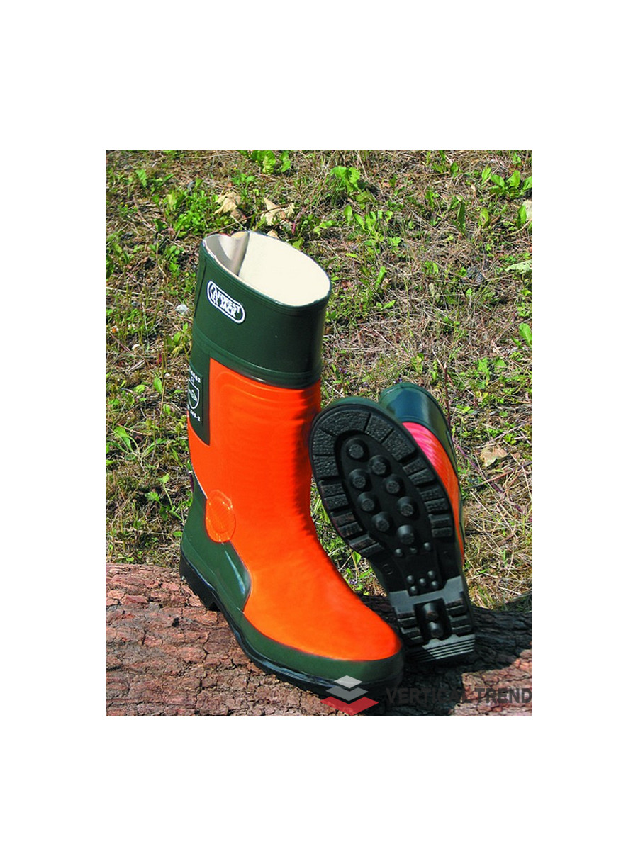 Cizme cauciuc pentru lucrul cu motofierastraul, cu bombeu metalic și lamelă antiperforație în talpă, partea superioară confecționată din amestec de cauciuc natural și sintetic, căputa ranforsată, extra protecție în zonă gleznei, întărită în zonă călcâiului, căptușeală interioară confecționată din amestec 50% bumbac și 50% poliester, antibacteriană, talpă din cauciuc antiderapantă, rezistentă la uleiuri, conforme cu EN ISO 17249-2004 CLASĂ 3 EN ISO 20345:2004, EN 381-9, certificate KWF, culoare portocaliu cu verde, mărimi-39-47.