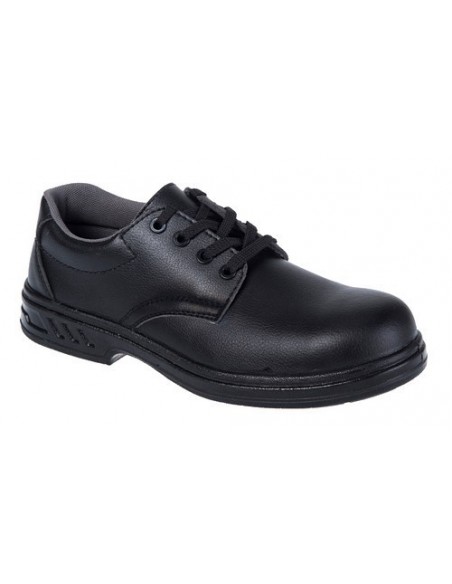 Pantofi de protecţie S2 albi, cu bombeu metalic, feţe din microfibră tratată pentru a fi rezistentă la apă - material rezistent la spălări, cu şiret, talpă din poliuretan rezistentă la: uleiuri, grăsimi, hidrocarburi, antiderapantă, antistatică, SRC, conformi cu norma europeană EN 20345-1/2011.