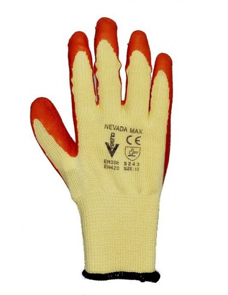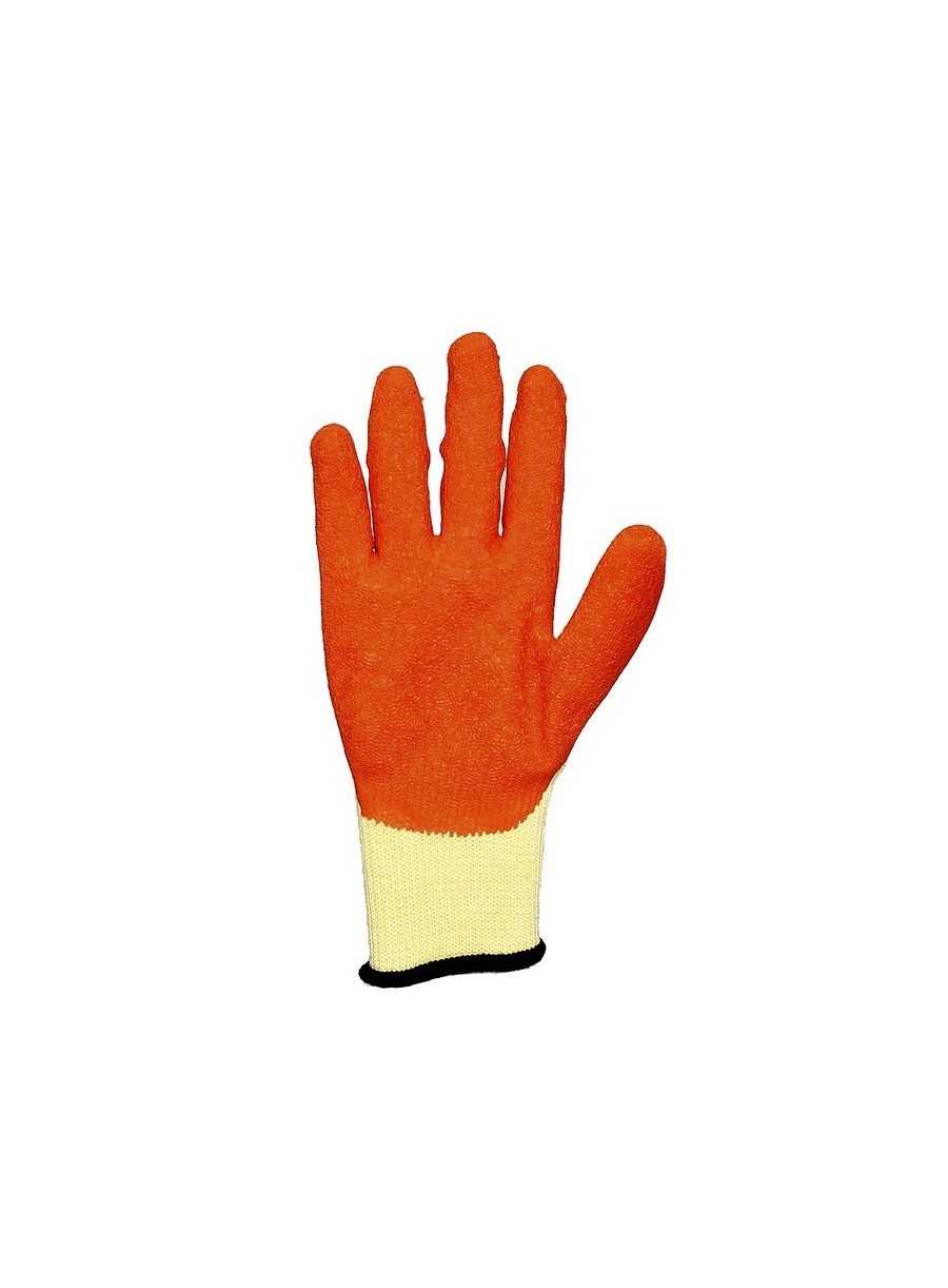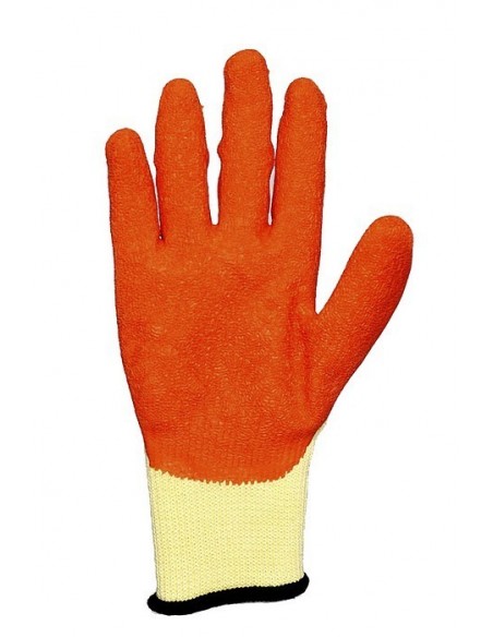 Mănuşi tricotate din bumbac/poliester imersate în latex în palma şi pe degete, dos aerisit, folosite în special pentru manipularea obiectelor alunecoase. Tricot din 5 fire, strat de latex dublu. EN 388(2243), EN 420.