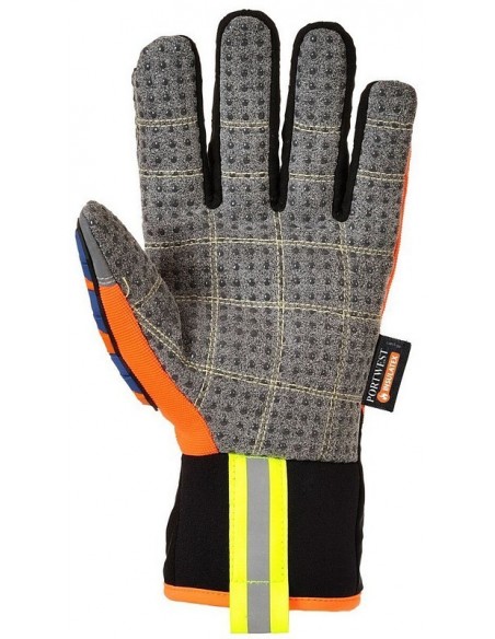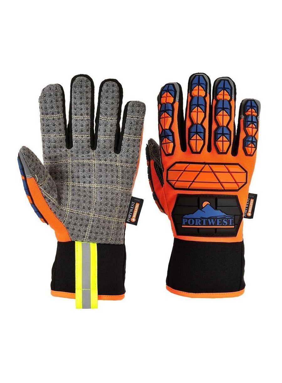 Mănuşi antiimpact din piele sintetica, elastan neopren, insulatex, PVC, TPR, întărite cu protecţie suplimentara pe dos - degete şi tendoane, aderenţă sporită(aplicatii punctiforme PVC pe palmă şi degete), durabilitate, protecţie antităiere şi impact, cu-loare orange/albastru, mănuşă 100% impermeabilă şi termică, EN 420, EN 388, EN 511.