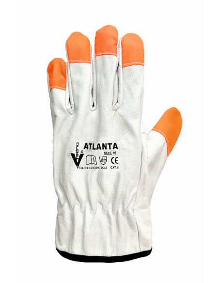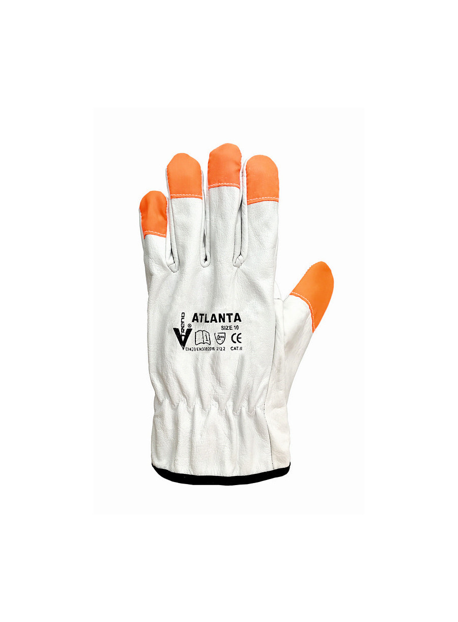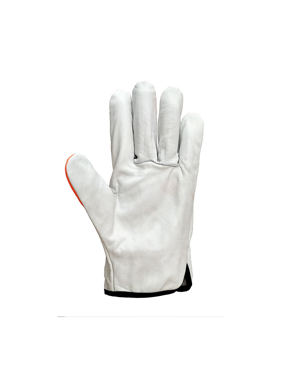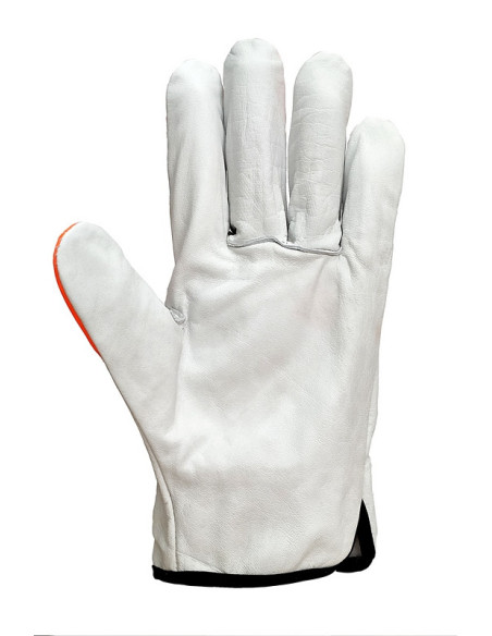 Mănuşi de protecţie lăcătuş din piele întreagă de capră, croială americană, manşetă din piele, elastic la spate pentru ajustare pe mână. Vârfurile degetelor sunt dublate pe dos cu material de mare vizibilitate pe timp de zi, de culoare portocalie.