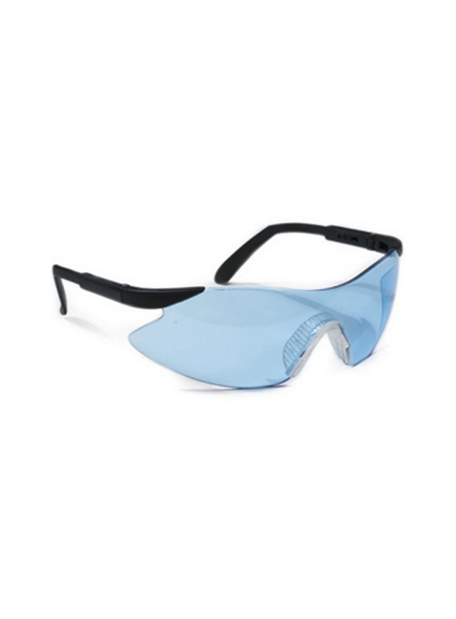 Ochelari de protecție monobloc, cu lentile albastru azur, antizgâriere și antiaburire, din policarbonat, brațe laterale din poliamidă, ajustabile 4 poziții, grosimea lentilei 2 mm, greutate redusa 27 gr.