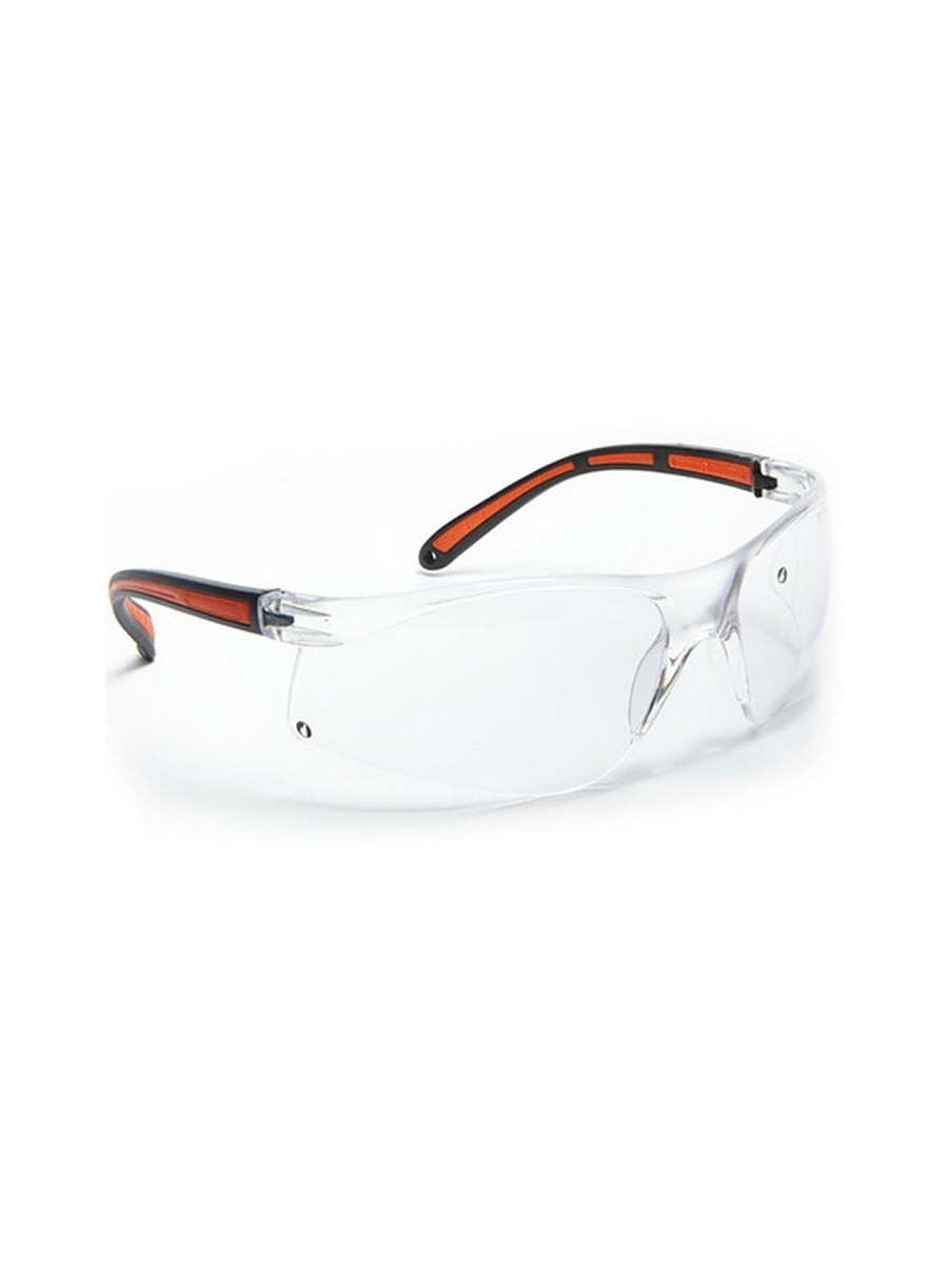 Ochelari de protecție cu lentile transparente din policarbonat, antizgâriere și antiaburire, protecție UV, ușor curbate pentru a oferi un câmp vizual larg, brațe laterale bicolore, dublu injectate din TPR și policarbonat, asigură o potrivire perfectă pe față, pad nazal turnat din policarbonat, puncte de fixare pe brațele laterale pentru șnur, grosimea lentilei 2 mm, greutate 24 gr.
