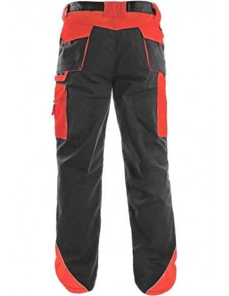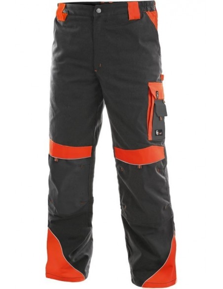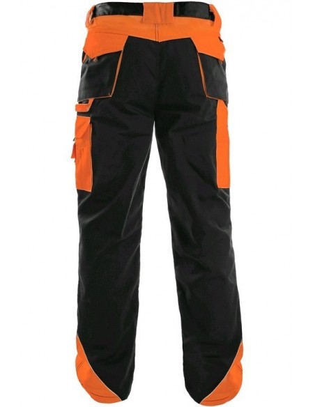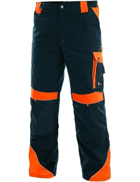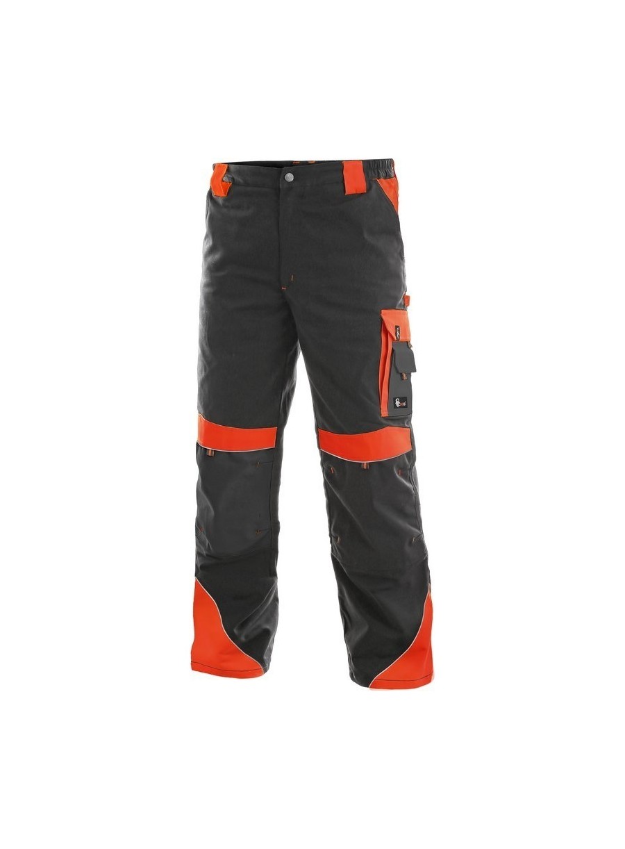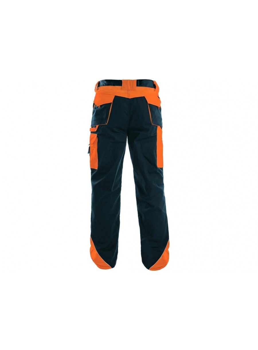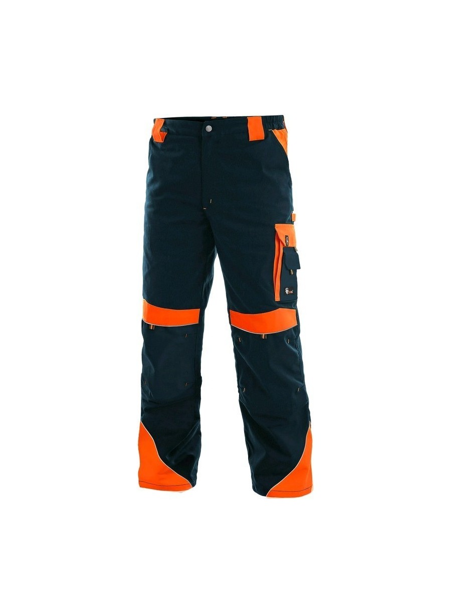 Pantaloni de lucru în talie, confecționați din amestec canvas 35% bumbac cu 65% poliester, densitate material 270g/mp, talie cu găici de curea, buzunare frontale, buzunare multifuncționale pe ambele părți, genunchi întăriți, cu deschidere pentru genunchiere, două buzunare cu clapetă la spate, accesorii reflectorizante, culori: negru-portocaliu, negru-galben, gri-roșu, albastru-roșu