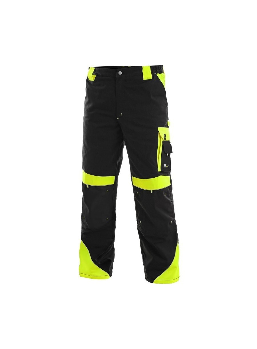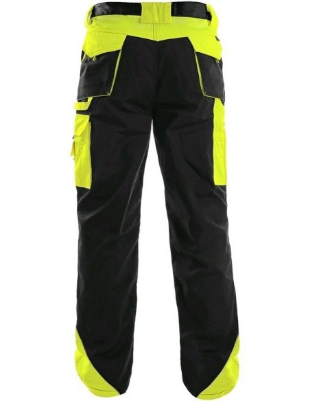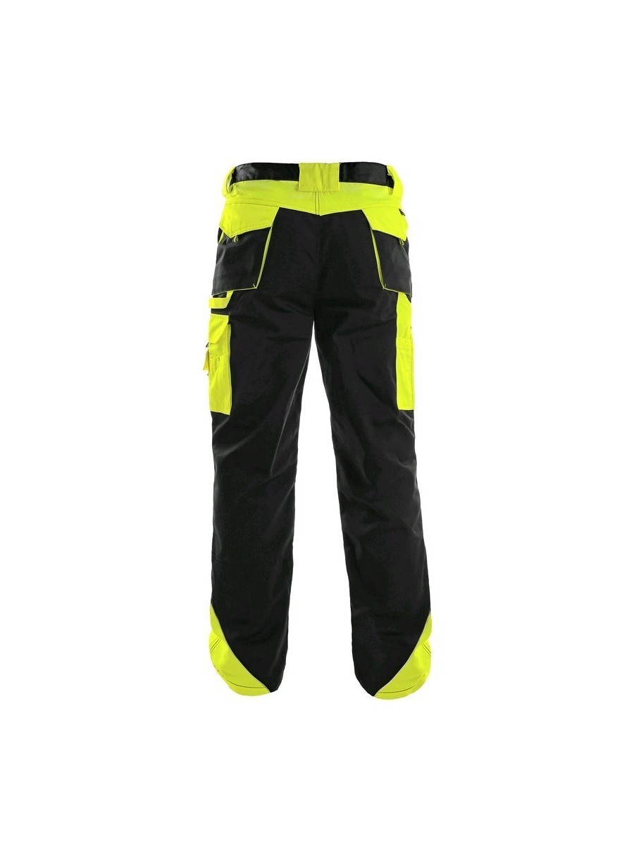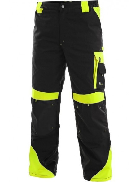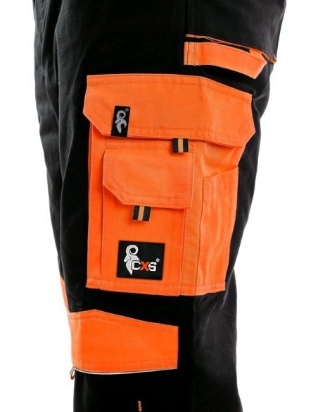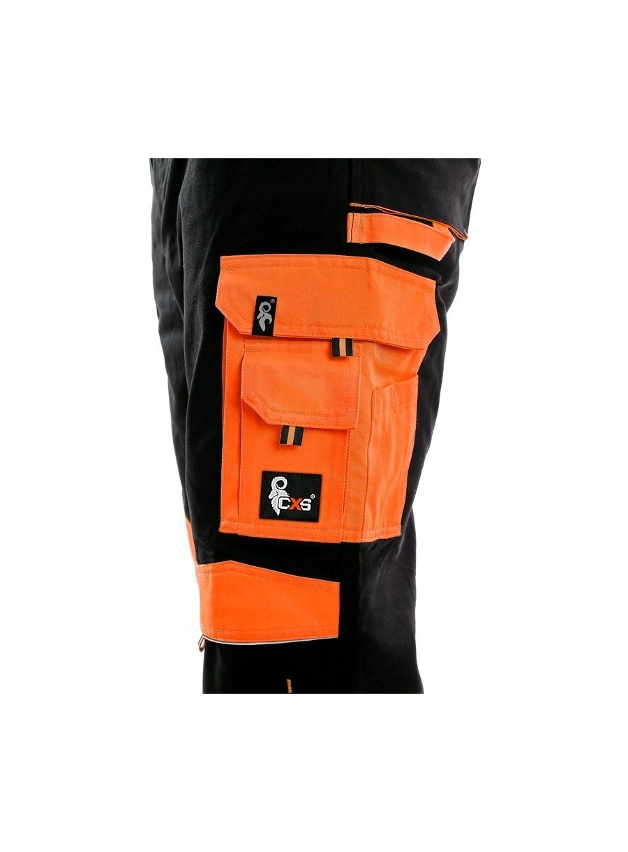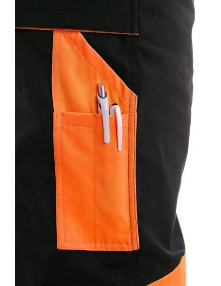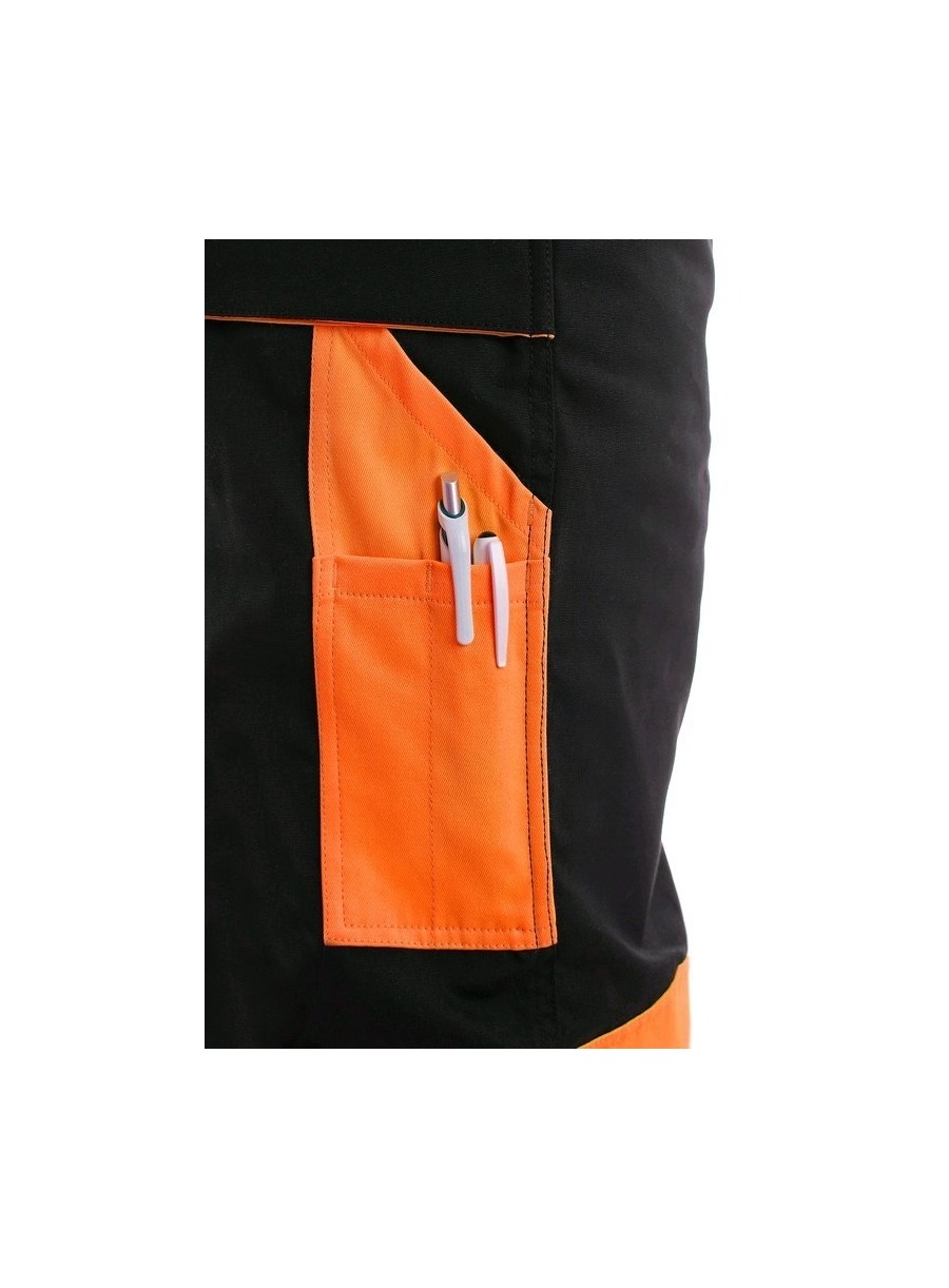 Pantaloni de lucru în talie, confecționați din amestec canvas 35% bumbac cu 65% poliester, densitate material 270g/mp, talie cu găici de curea, buzunare frontale, buzunare multifuncționale pe ambele părți, genunchi întăriți, cu deschidere pentru genunchiere, două buzunare cu clapetă la spate, accesorii reflectorizante, culori: negru-portocaliu, negru-galben, gri-roșu, albastru-roșu