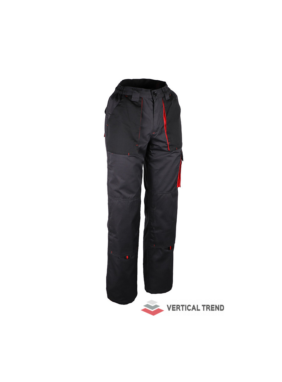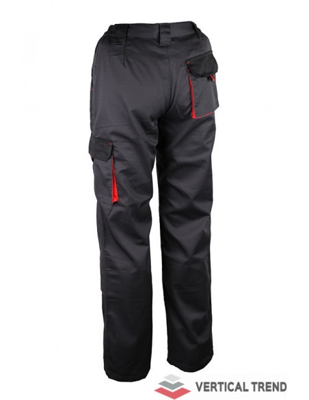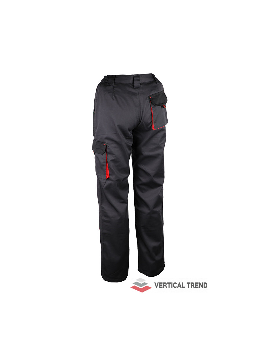 Pantaloni de lucru, confecționați din 65% poliester / 35% bumbac, 245 g / mp, culoare: gri antracit / negru / roșu, talie elastică, 2 buzunare înclinate în talie, 1 buzunar pe piciorul stâng, 1 buzunar din spate, închidere cu fermoar și buton, găici pentru curea, buzunare pentru genunchere.
