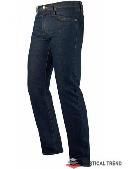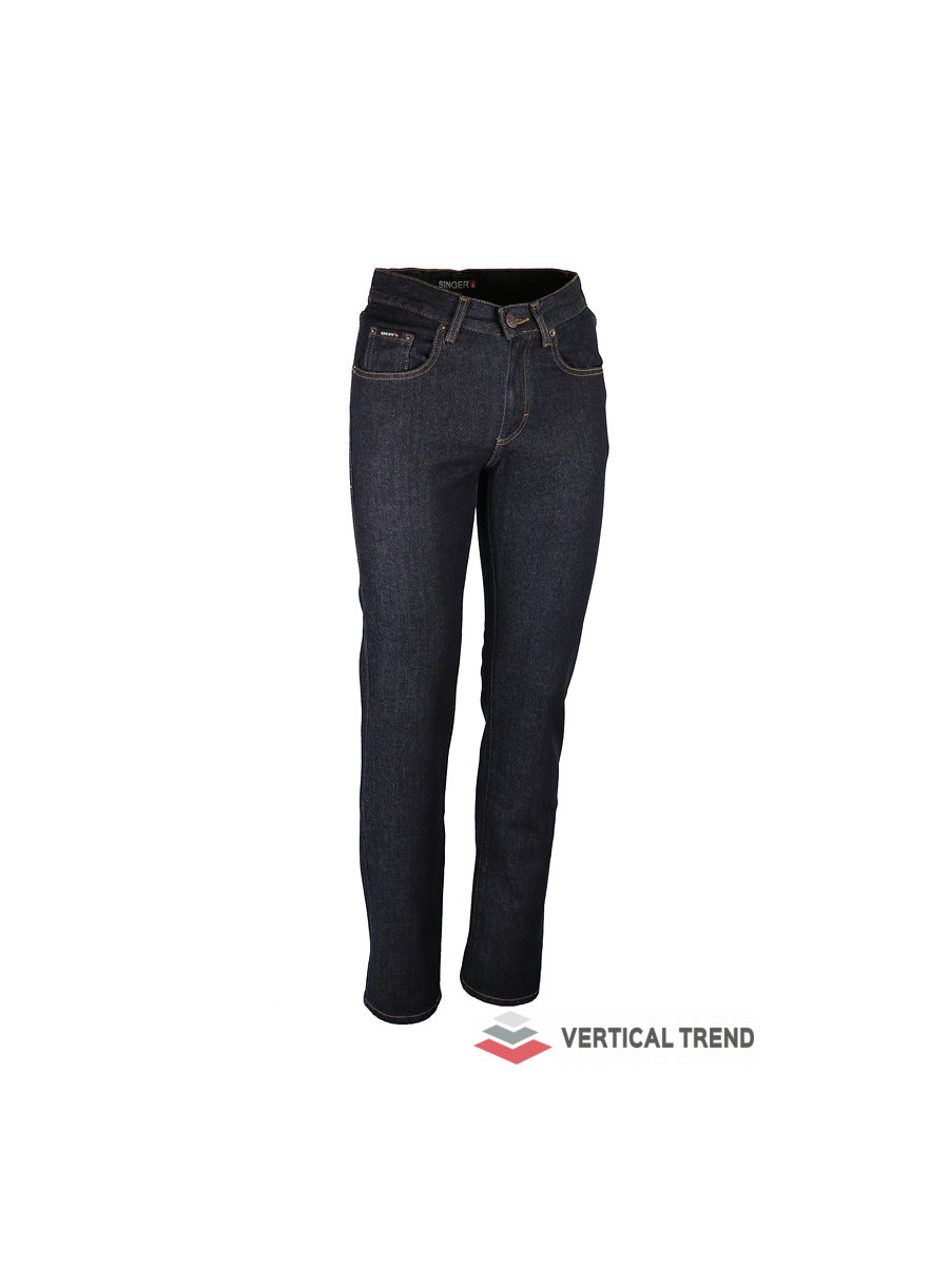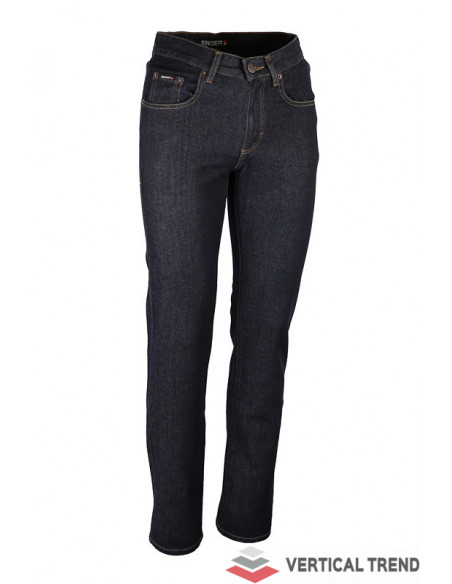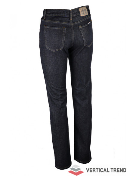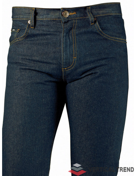 Pantaloni de lucru tip blugi, pentru bărbați, confecționați din 100% bumbac Denim 13 oz, 420 g/mp, tăietură dreaptă, culoarea albastră, găici pentru curea, închidere cu fermoar sub clapetă, design clasic cu cinci buzunare.