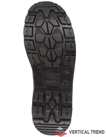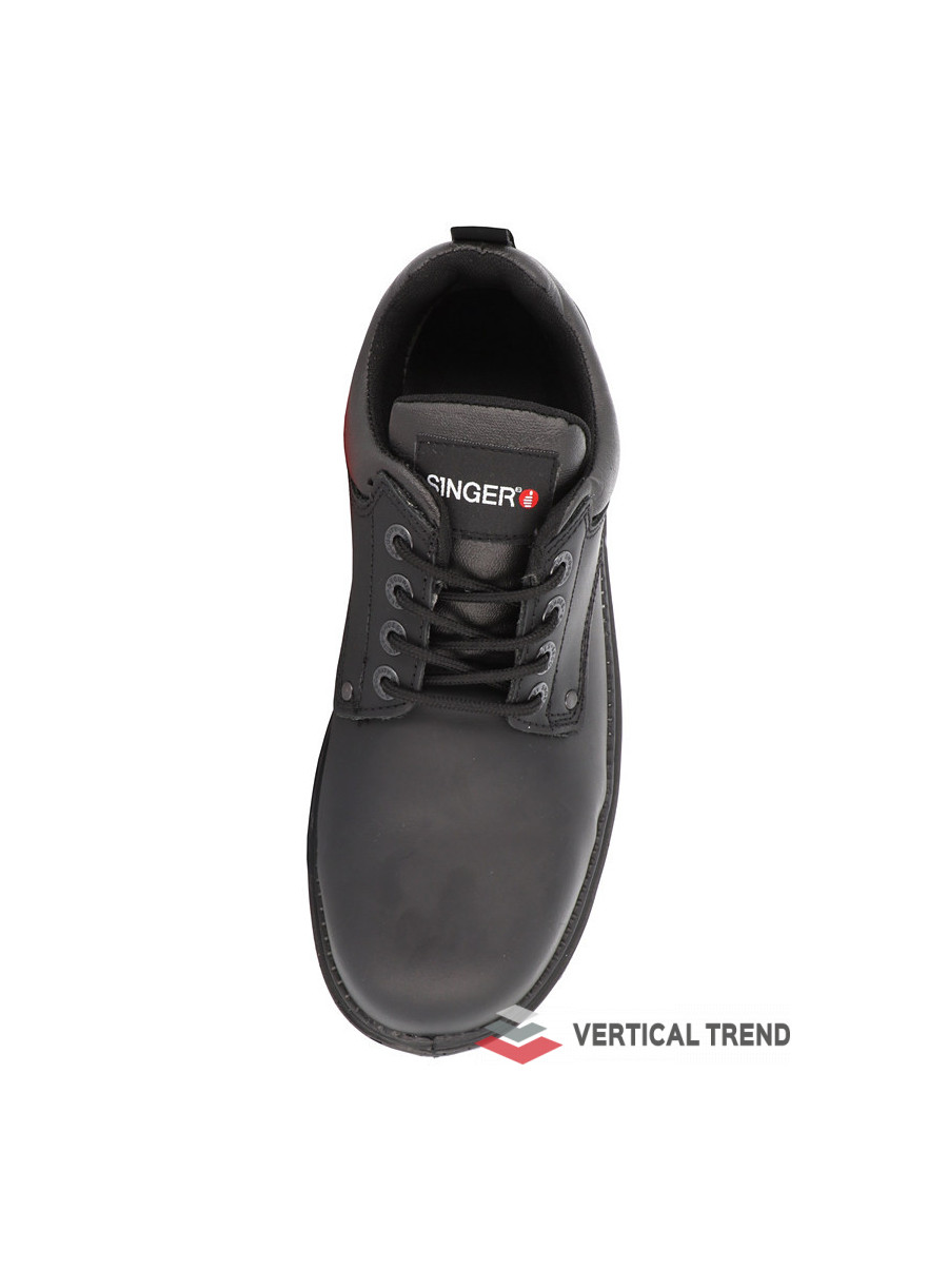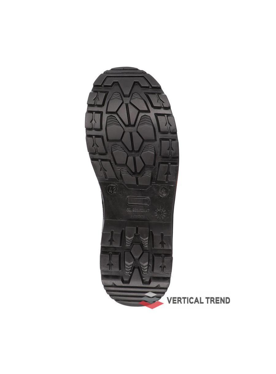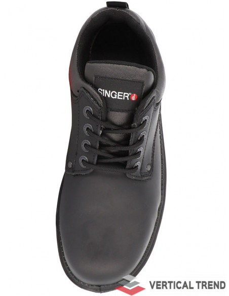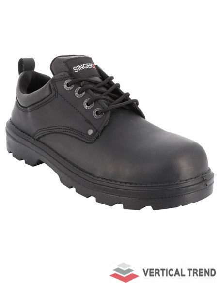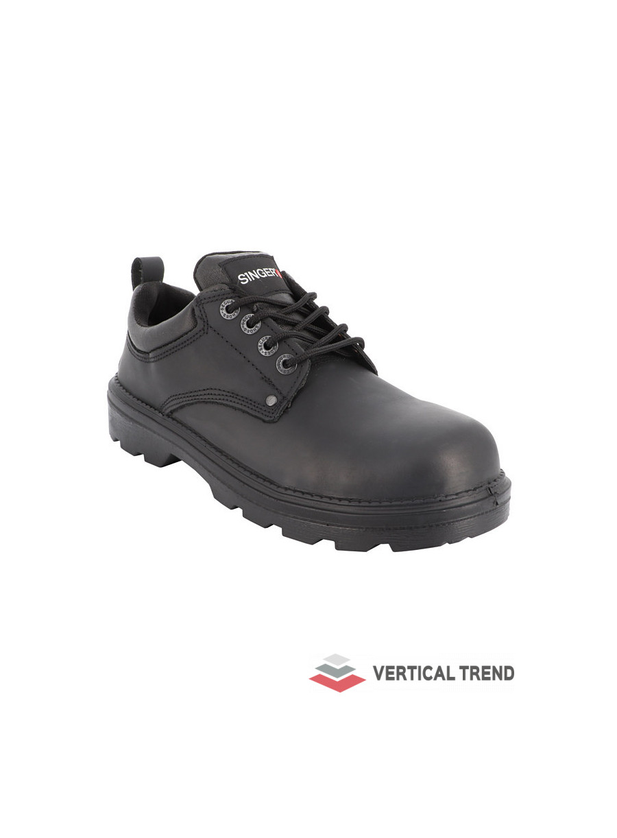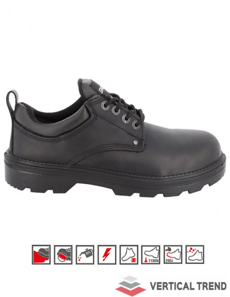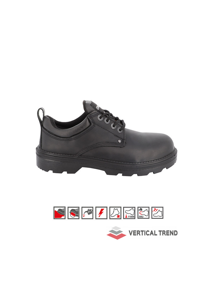 Pantofi de protecţie S3 SRC, cu bombeu din material compozit şi lamelă antiperforaţie textilă, confecționați din piele integrala spalt de bovină, tratată pentru a fi rezistentă la apă, limbă cu clini, inchidere cu șireturi și ochiuri, talpă din poliuretan PU dublă densitate rezistentă la: uleiuri, grăsimi, hidrocarburi, antiderapantă, antistatică, SRC , culoare neagra