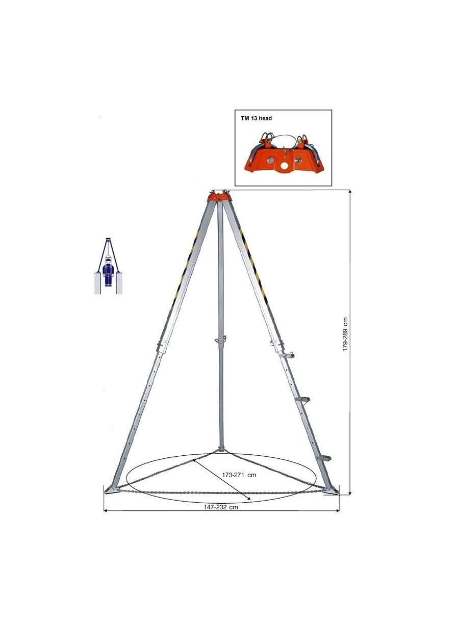Tripod pentru ancorare și salvare din aluminiu, cu trei puncte de ancorare la capăt. Se poate folosi de către maxim 2 persoane simultan pentru urcare și coborâre. Distanța dintre suporți este cuprinsă între 114-232 cm, deschidere între Ø 173-Ø 271 cm, înălțime reglabilă între 179-289 cm, greutate 37 Kg. Picioarele suport sunt prevăzute cu tălpi din cauciuc pentru o bună poziționare și fixare a acestuia pe pozițiile de lucru.